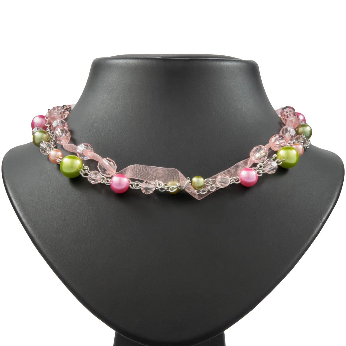 Drei verschiedene Ketten wurden liebevoll zu einem verspielten Schmuckstück vereint. Perlen in Grün, Pink und Apricot wechseln sich gekonnt mit roséfarbenen Kunststoffelementen ab. Auch das rosafarbene Organzaband wird von den roséfarbenen Kugeln begleitet. Dank des kleinen Verlängerungskettchens individuell tragbar. Ein Schmuckstück, das Ihr Styling perfekt abrundet.