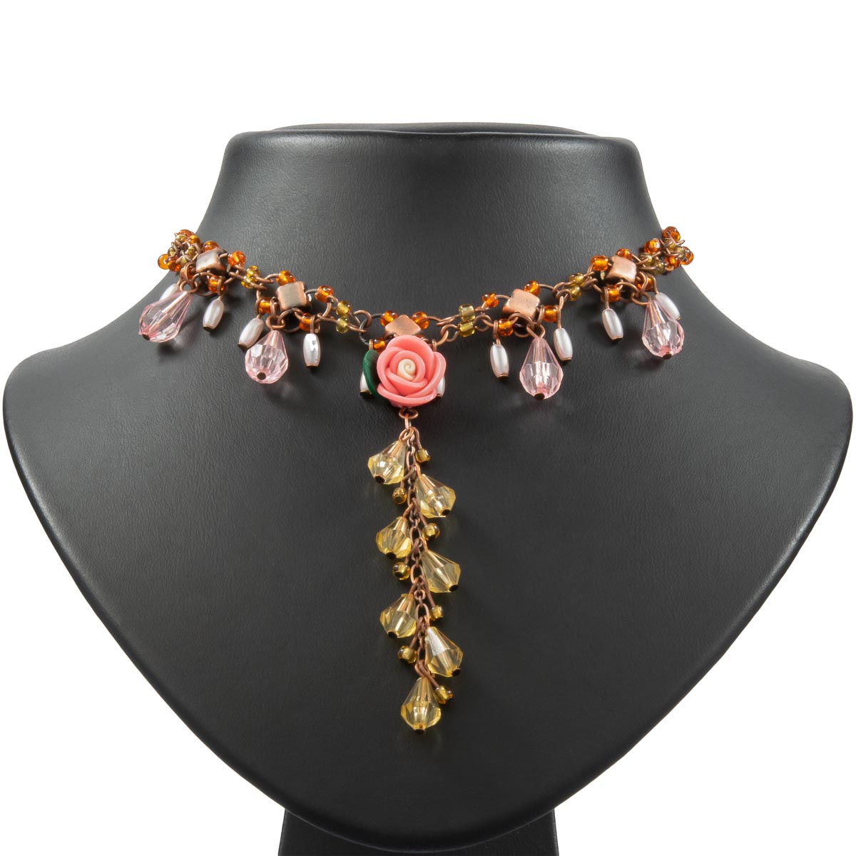 Die zarte Kette in antikkupferfarben wird von orange- und roséfarbenen Kunststoffelementen farblich hervorgehoben. Mit Liebe zum Detail wurde die Rosenblüte als Highlight gearbeitet. Das feminine Y-Design wird von gelben Kunststoffelementen unterstützt. Ein verspielter Begleiter für Ihren Sommerlook.