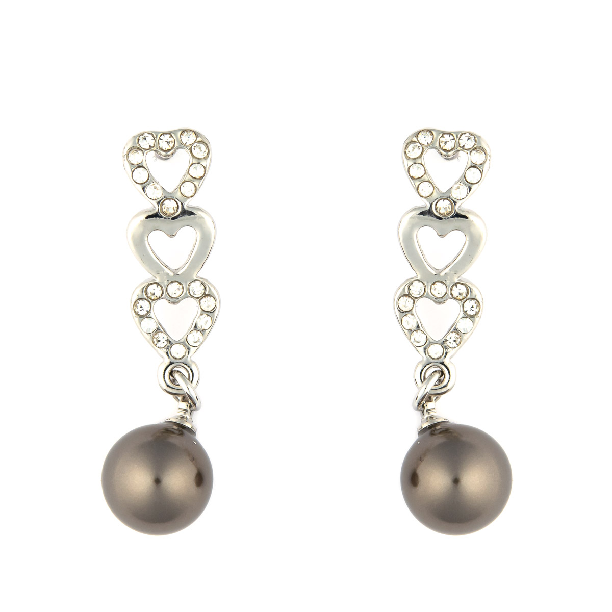 Drei kleine silberfarbene Herzen, zum Teil mit funkelnden Schmucksteinen, begleiten die bewegliche Perle. Ein schönes Zusammenspiel von grau und silber im romantischen Design.