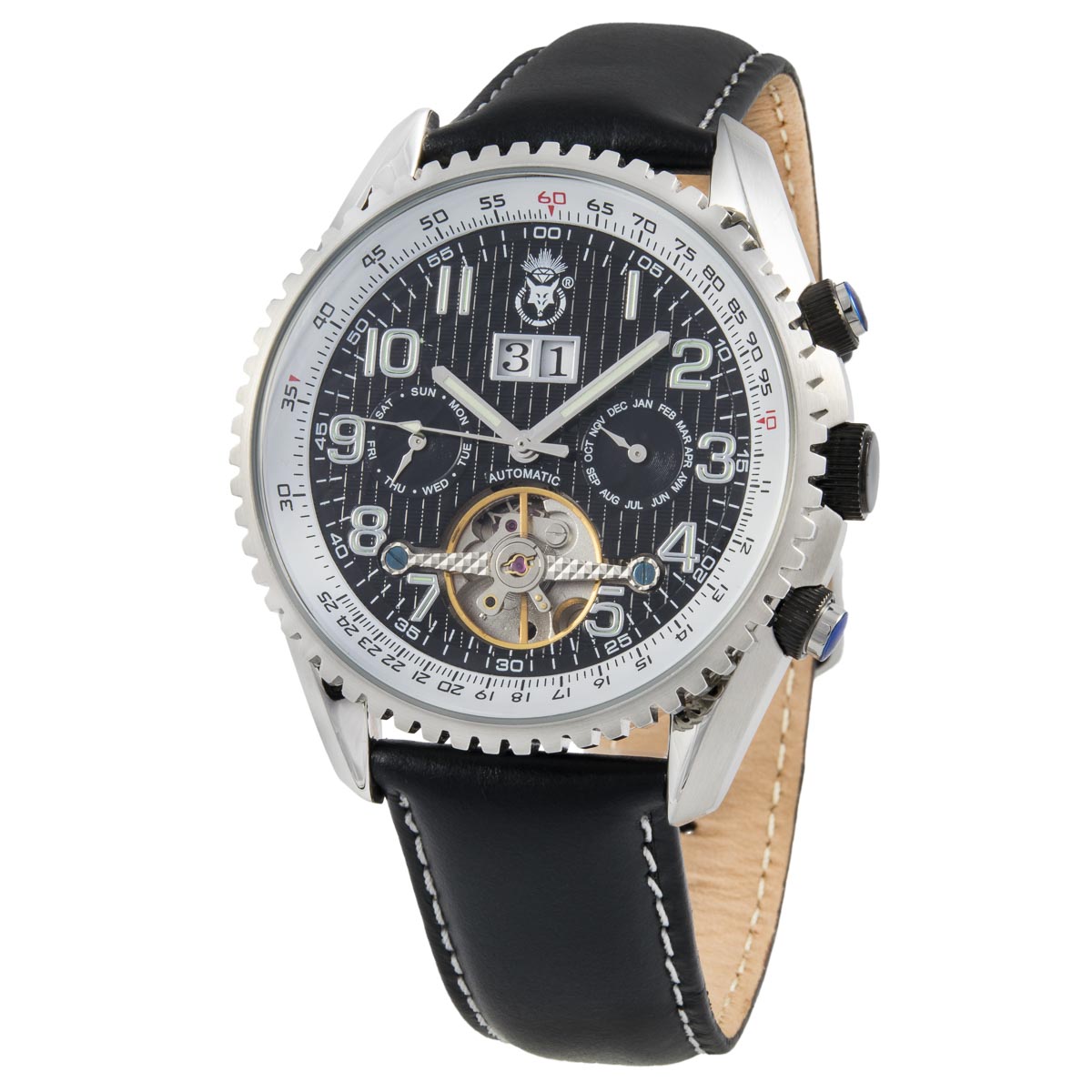Diese edle Automatik-Uhr verfügt über ein flaches, matt gebürstetes Edelstahl-Gehäuse. Das schwarze Leder-Armband mit weißer Steppnaht und Dornschließe bietet einen hohen Tragekomfort. Das analoge Ziffernblatt zeigt neben der Datumsanzeige auch Monat und Wochentag an. Durch den Glasboden können Sie die Uhr arbeiten sehen. Hier wird die schwarze Uhr durch einen silbernen Gehäusering hervorgehoben.