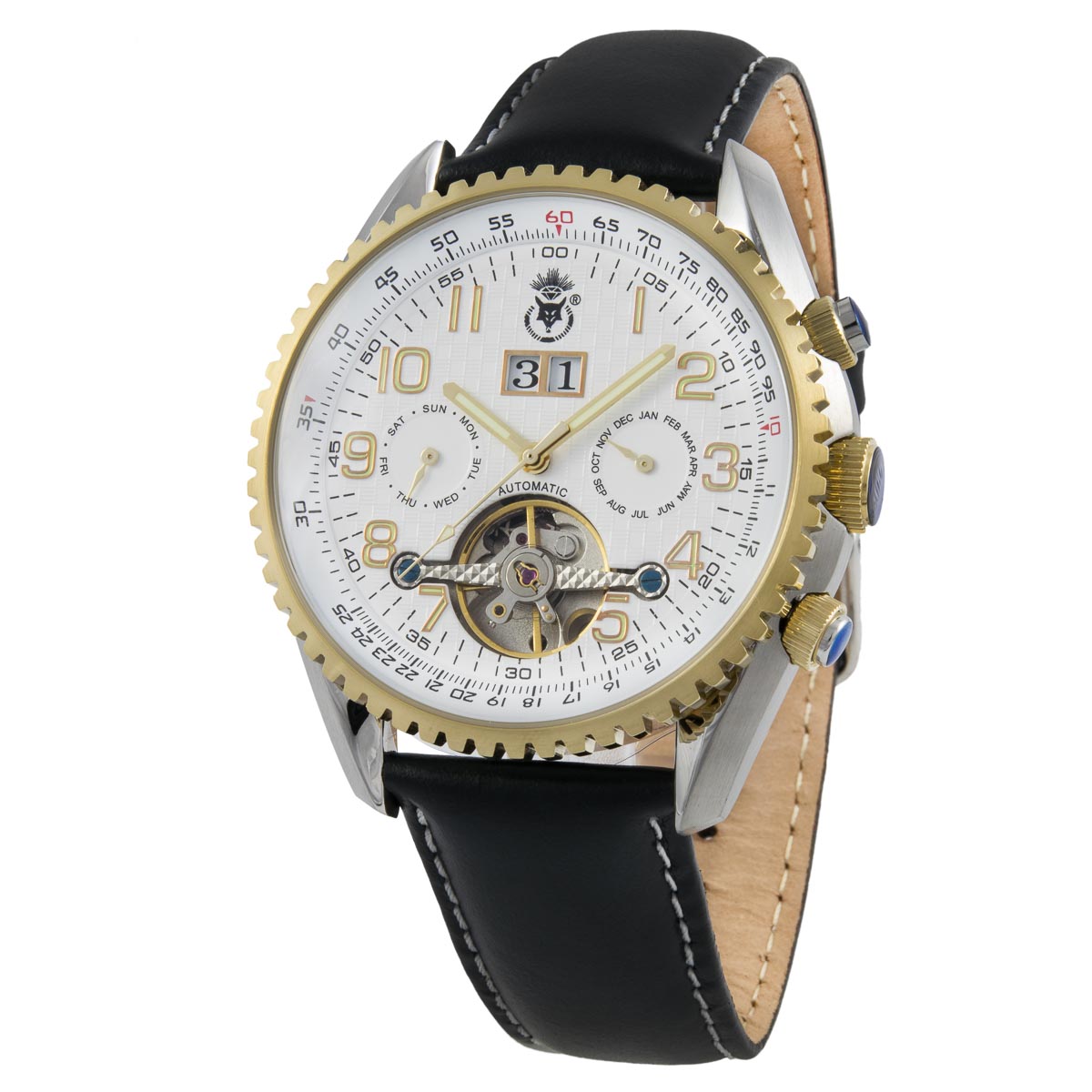 K.V. Fuchs Design, Armbanduhr, Herren, analog, Echtleder, weiß, schwarz, Glasboden, Monat, Datum, Tag, 5 ATM - 14041534