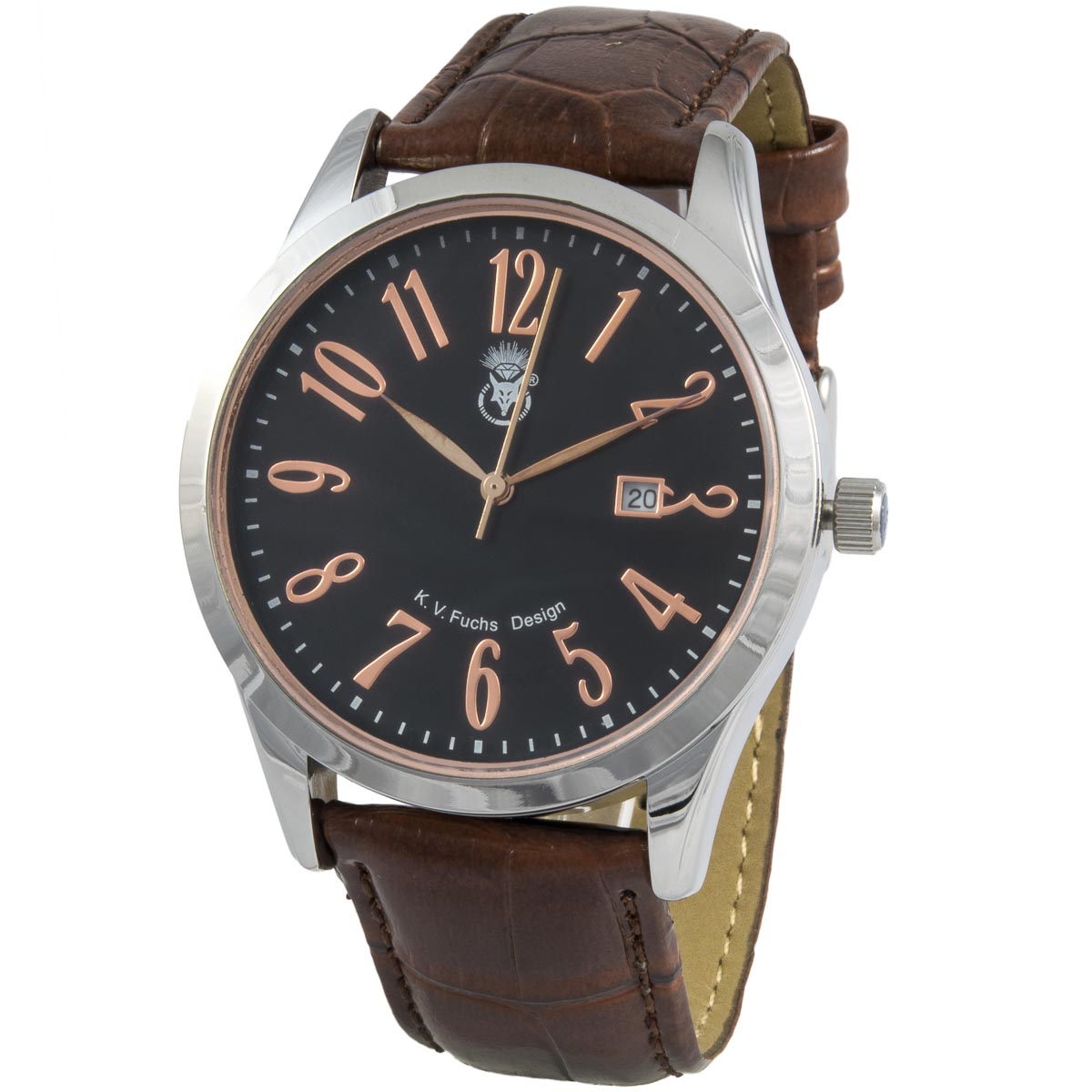 K.V. Fuchs Design Herren Quarzuhr analog Armbanduhr in silber, schwarz mit Lederarmband in braun »U-49-02-Schwarz«