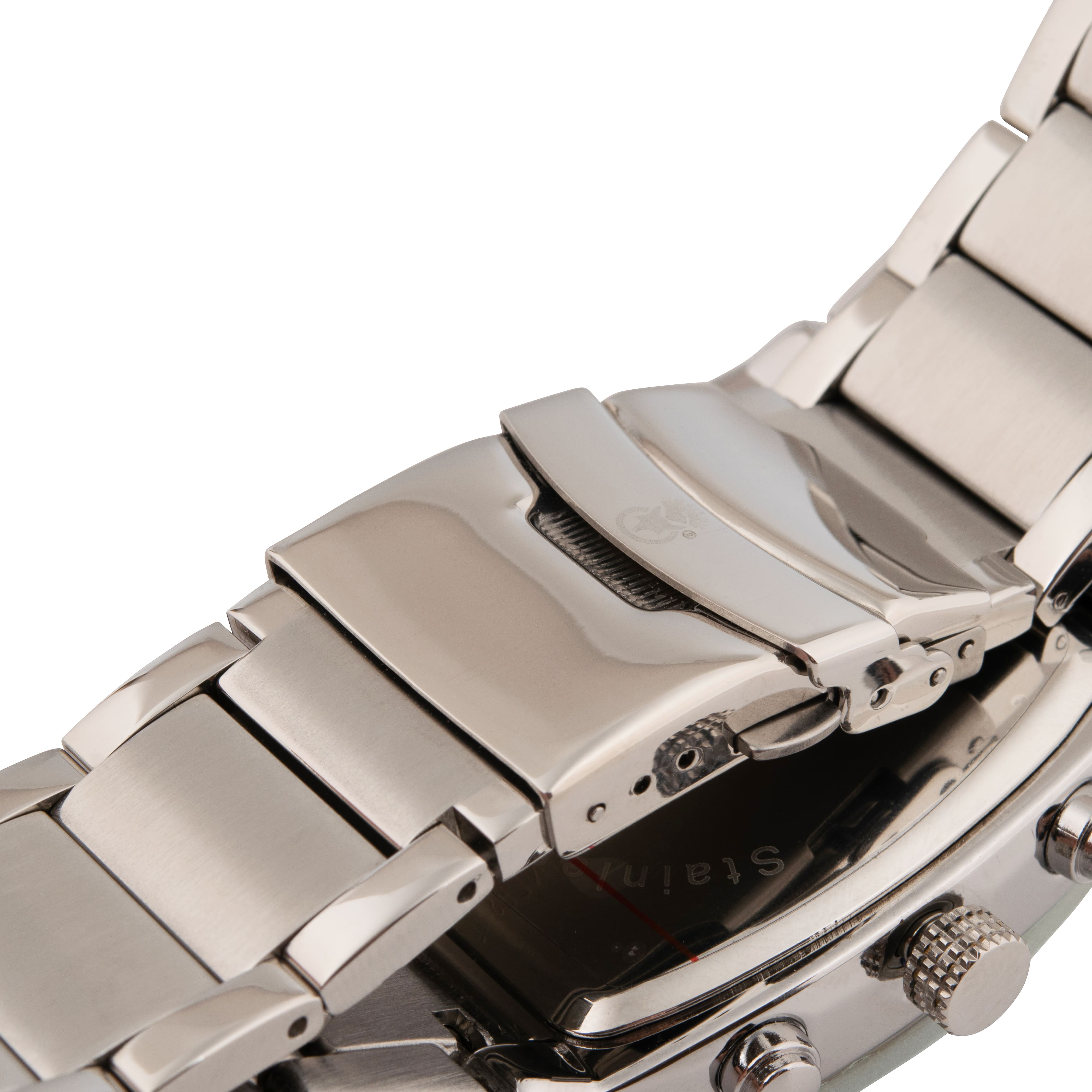 Zeitlos elegant erscheint die Herren-Uhr in Chronographen-Optik am Handgelenk. Das silberfarbene Gehäuse wird von dem farblich passenden Edelstahl-Armband mit Faltschließe gekonnt begleitet. Das aufgesetzte Uhrenglas in Dunkelbraun verleiht der Uhr Raffinesse. Die mit Leuchtfarbe beschichteten Zeiger und die silberfarbenen Stundenpunkte passen perfekt zu dem braunen Zifferblatt. Die mit einem dünnen Silberrand versehene Datumsanzeige wird ebenso wie die Uhrzeit über die Krone auf der rechten Seite eingestellt. Die geschmackvolle Optik überzeugt auf Anhieb.