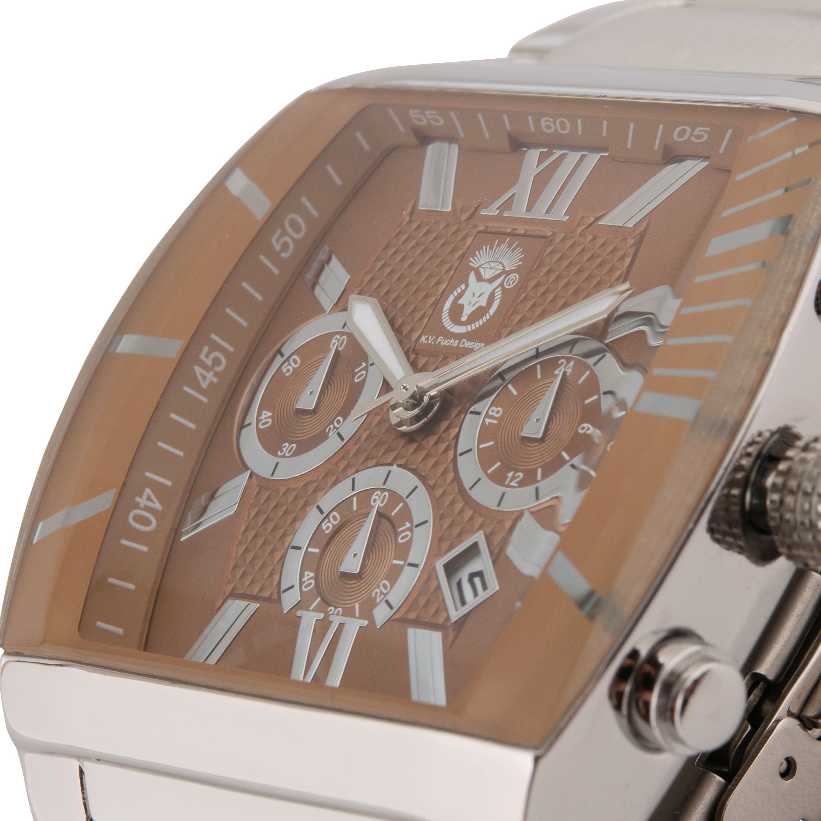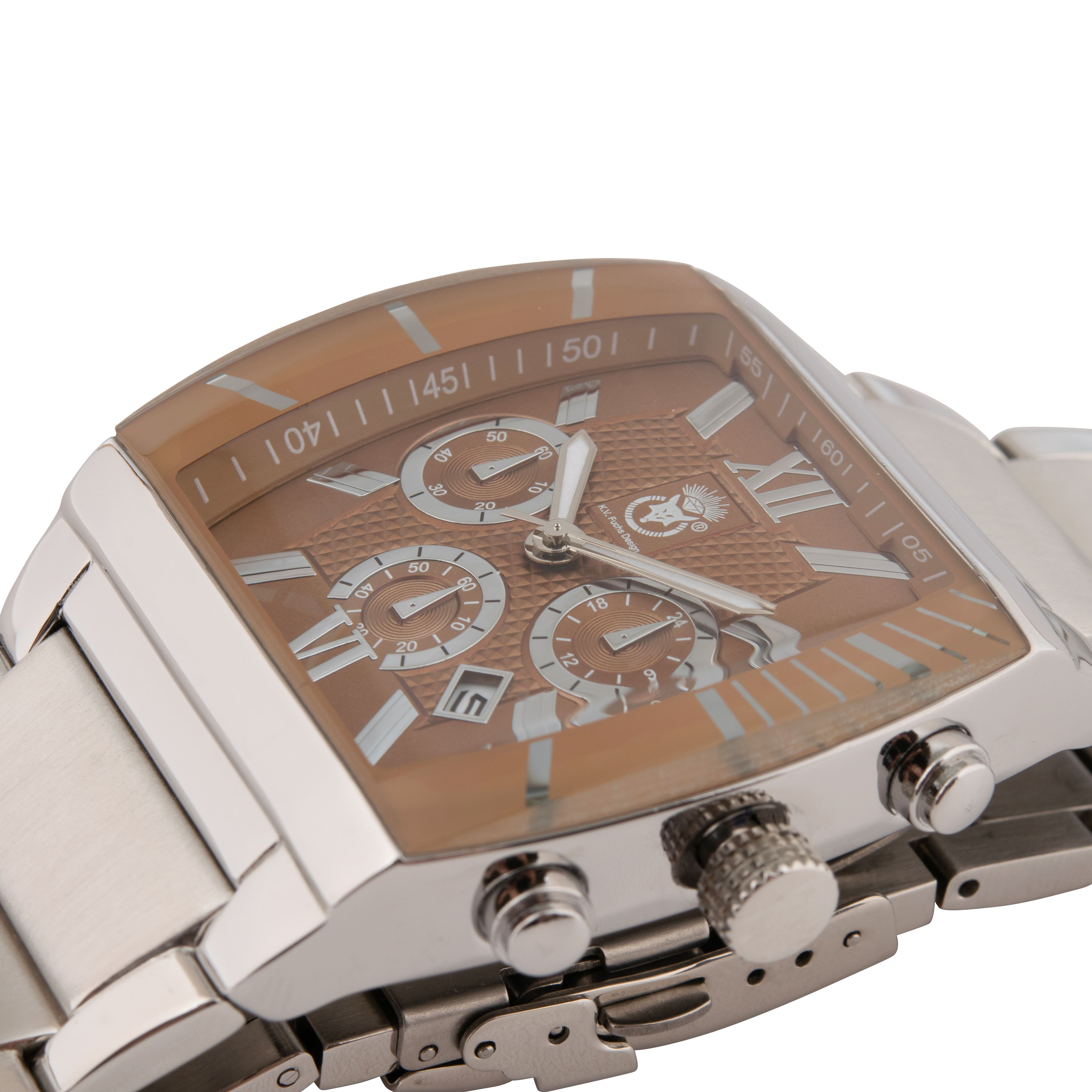 K.V. Fuchs Design Herren Quarzuhr analog Armbanduhr mit Faltschließe in braun, silber mit Edelstahlarmband in silber »U-99-01-Braun-Silber«
