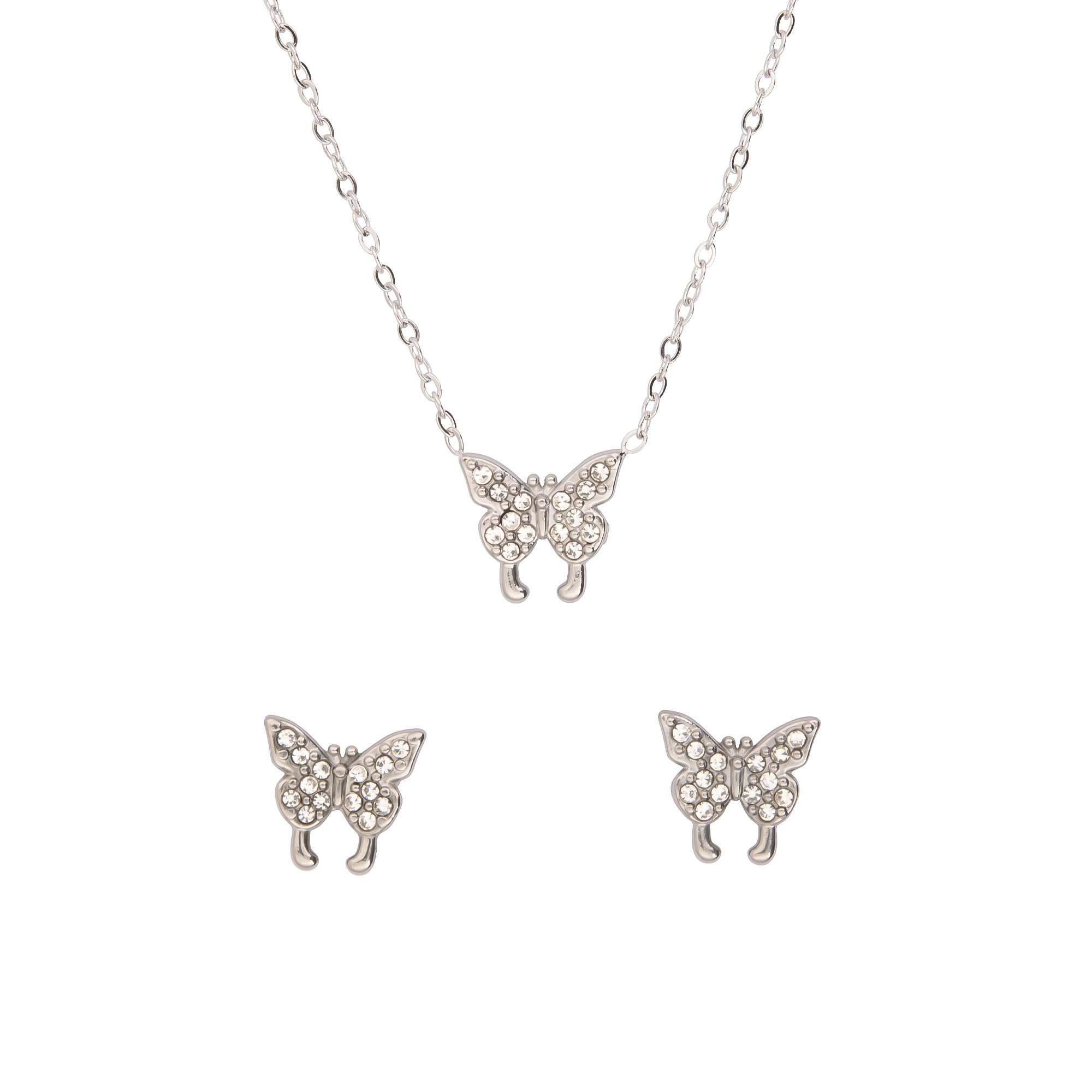 K.V. Fuchs Design Damen Schmuck-Set aus Edelstahl in Silber - Kette & Ohrstecker Schmetterling mit weißen Steinen - 14042019