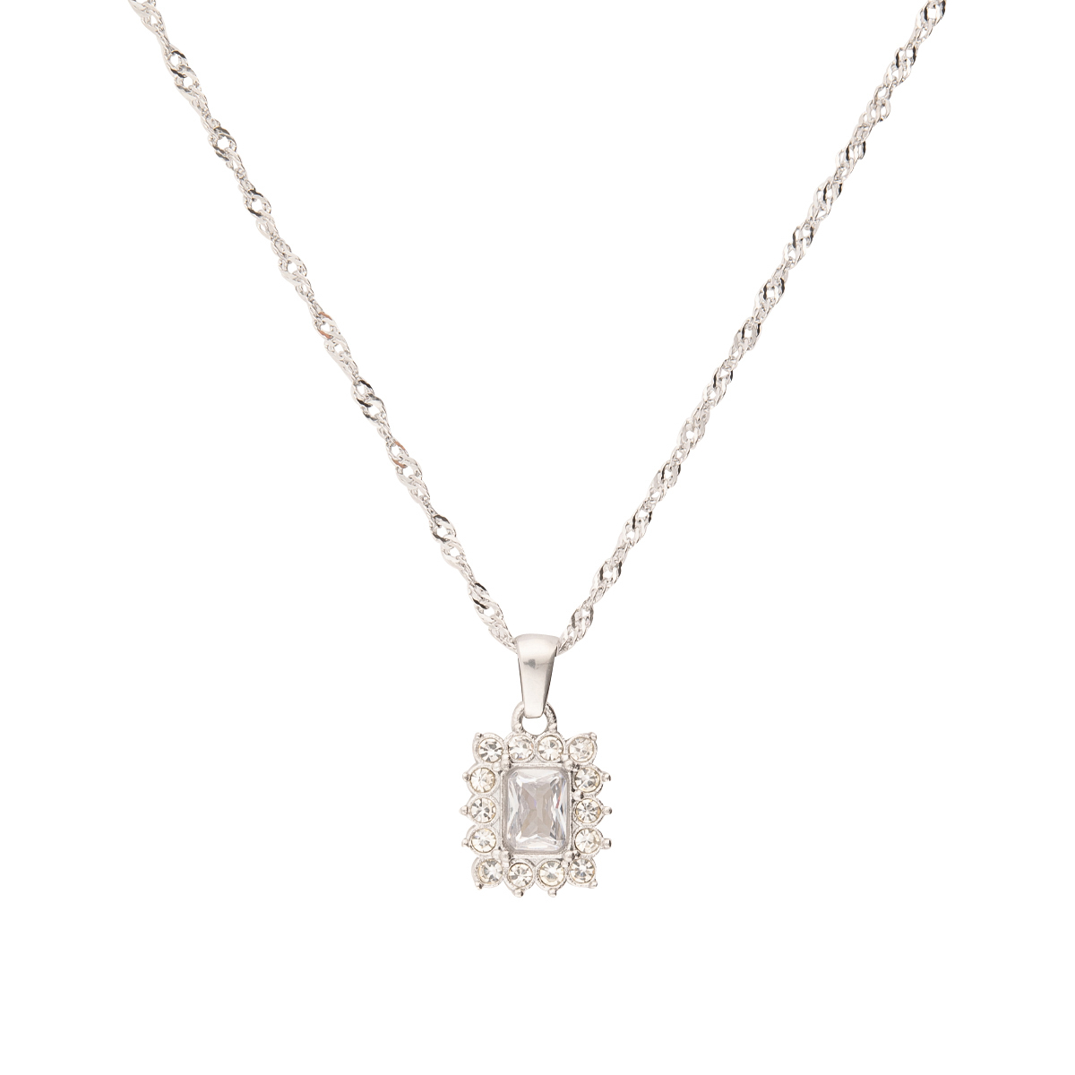 Diese Damen-Halskette kombiniert klare Form mit feminine(m) Funkeln. Der weiße, rechteckige Stein steht im Mittelpunkt und wird von einer feinen Reihe kleiner Ziersteine eingefasst - das sorgt für eine besonders strahlende, hochwertige Optik. Die silberfarbene Edelstahlkette passt zu schlichten Outfits genauso gut wie zu festlichen Looks und setzt einen eleganten Farbakzent. Edelstahl macht die Kette langlebig und pflegeleicht, der Karabinerverschluss sorgt für sicheren Halt. Perfekt auch als Geschenk.