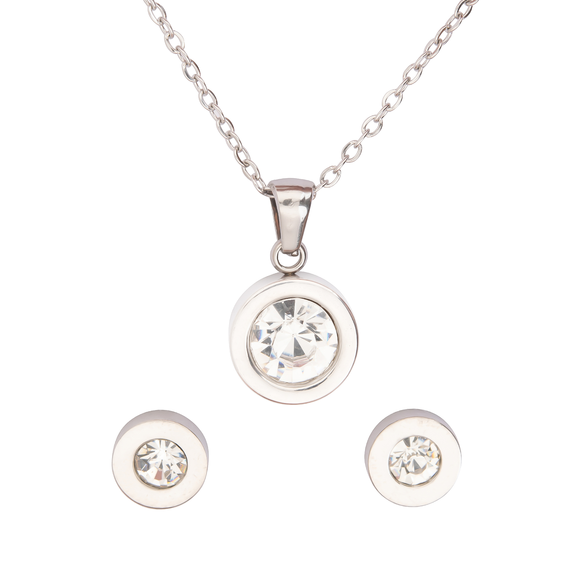 Dieses Damen-Schmuckset verbindet minimalistische Eleganz mit einem hochwertigen Look: Die silberfarbene Edelstahlkette trägt einen runden Anhänger mit weißem, facettiertem Stein - dazu passen die Ohrstecker im gleichen Design. Die glatte, klassische Fassung betont den Stein und sorgt für ein klares, modernes Erscheinungsbild. Dank Edelstahl ist das Set robust und ideal für den Alltag, wirkt aber zugleich edel genug für besondere Momente. Perfekt, wenn du ein harmonisches Set suchst, das jedes Outfit aufwertet - oder ein stilvolles Geschenk.