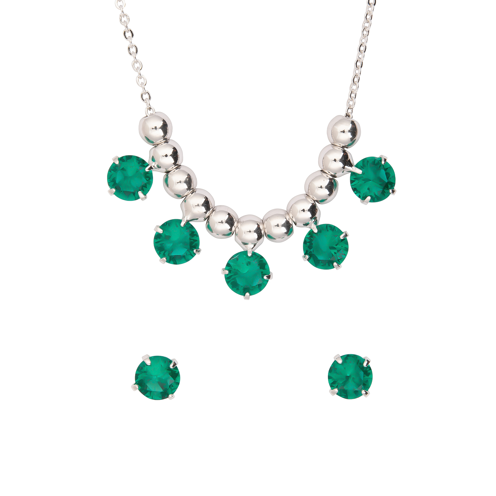Dieses Damen-Schmuckset setzt auf einen trendigen, glamourösen Look. Die silberfarbene Kette ist mit einer Reihe polierter Kugeln gestaltet, an denen grün funkelnde Steine hängen - so entsteht ein lebendiger, beweglicher Glanz bei jeder Bewegung. Die passenden Ohrstecker ergänzen den Look mit einem klaren Solitär-Akzent und lassen sich auch einzeln vielseitig tragen. Ideal für Abend-Outfits, Events oder als funkelndes Highlight zu schlichten Styles. Der Karabinerverschluss sorgt für sicheren Halt.