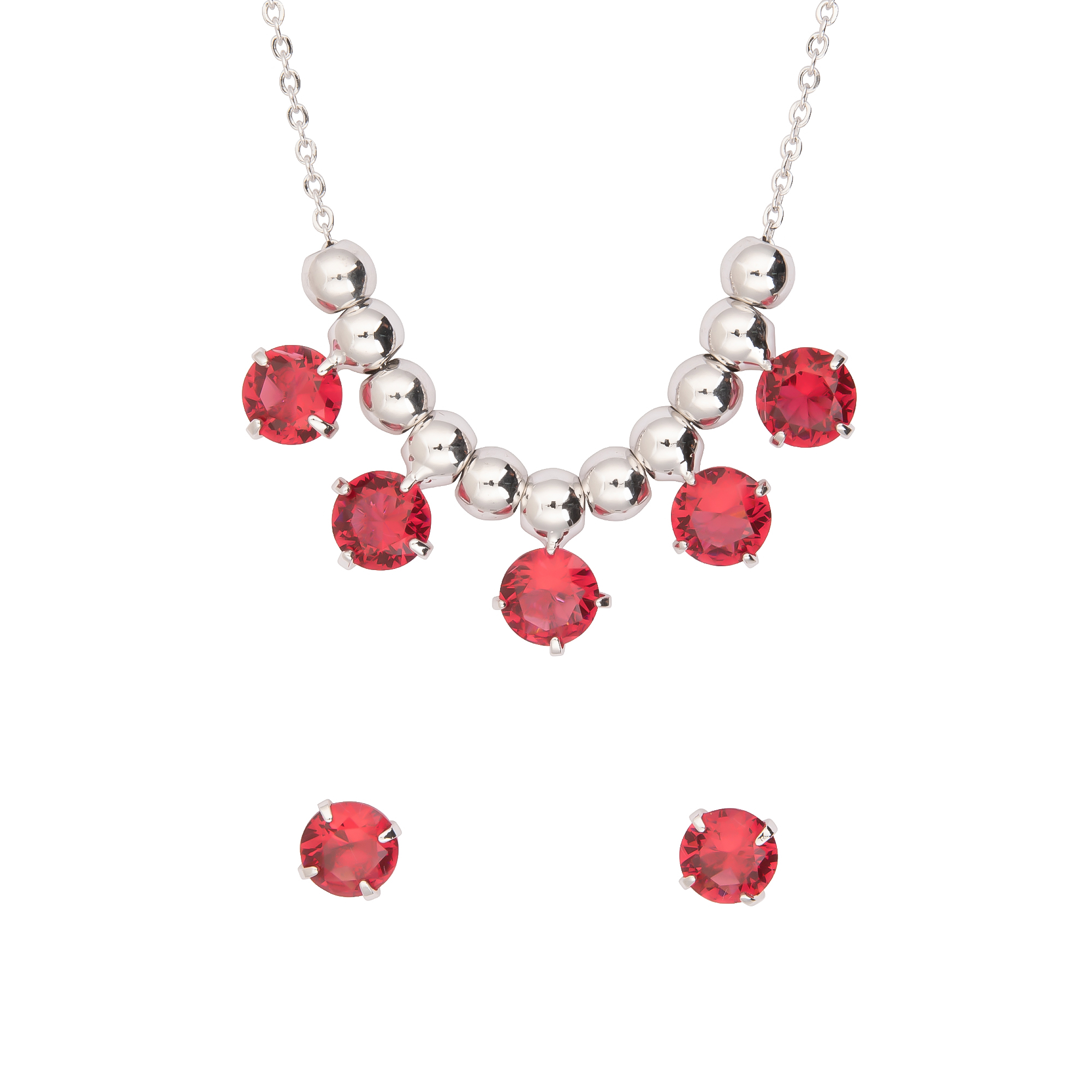 K.V. Fuchs Design Damen Schmuck-Set in Silber - Kette & Ohrstecker mit Kugel-Elementen und roten Steinen - 14042051