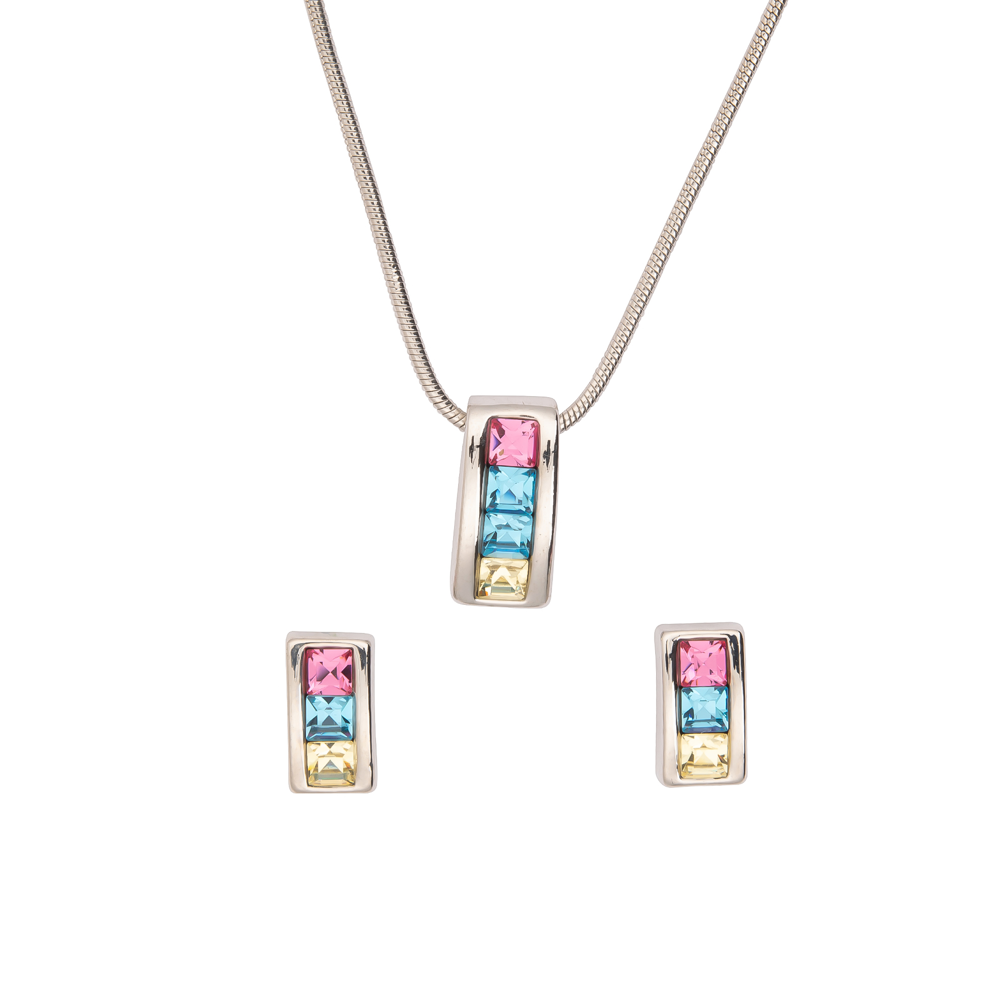 Dieses Damen-Schmuckset bringt Farbe in deinen Look, ohne dabei aufdringlich zu wirken. Der rechteckige Anhänger und die passenden Ohrstecker setzen auf ein klares Design, das durch die mehrfarbigen Steine in Blau, Gelb und Rosa zum Blickfang wird. So lässt sich das Set vielseitig kombinieren - perfekt zu neutralen Outfits, zu Denim oder als frischer Akzent im Sommer. Die silberfarbene Optik wirkt modern und zeitlos, der Karabinerverschluss sorgt für sicheren Halt. Auch als Geschenk eine schöne Wahl für alle, die Farbe lieben.