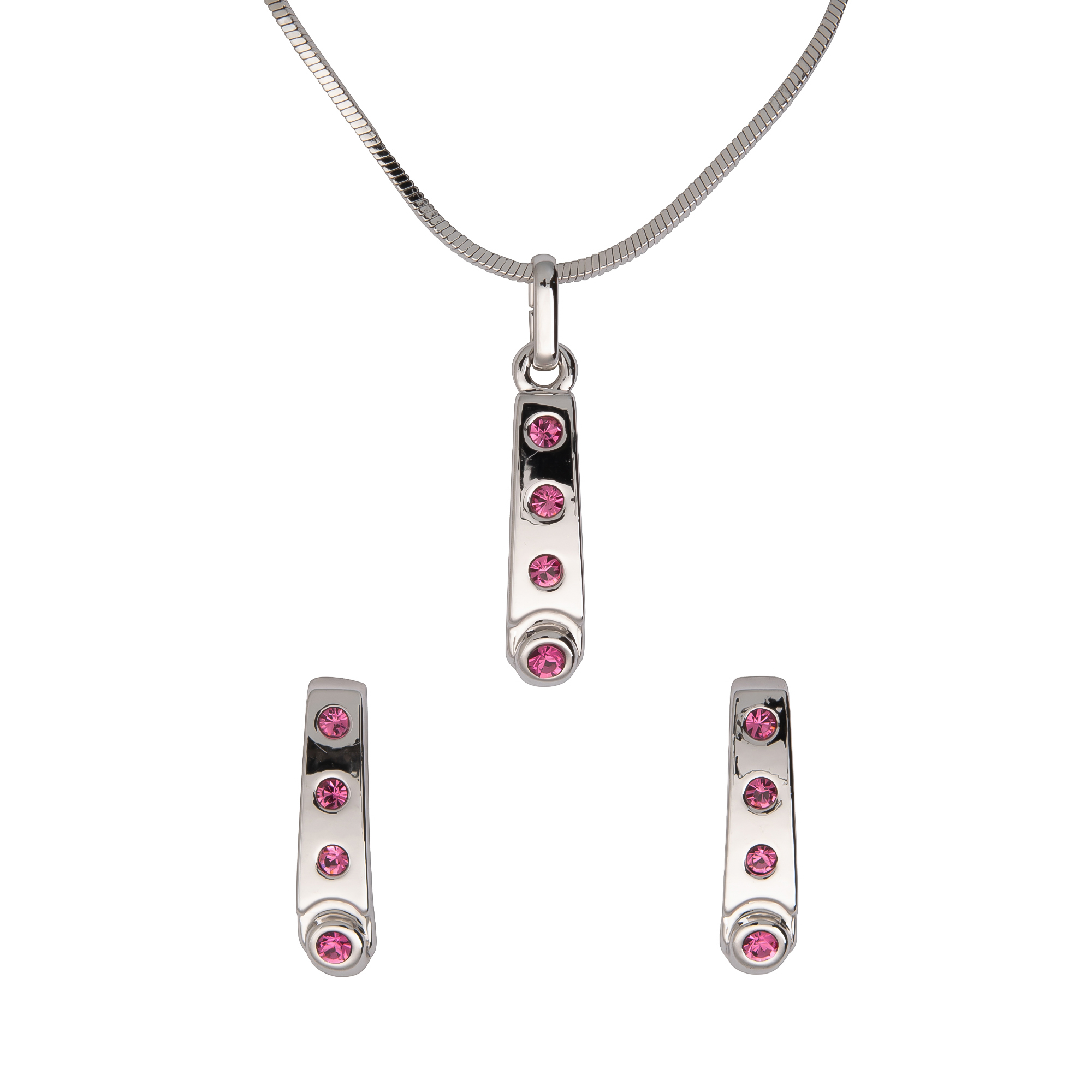 Dieses Damen-Schmuckset überzeugt mit einem modernen, geradlinigen Look. Der silberfarbene Anhänger und die passenden Ohrstecker sind länglich gestaltet und mit rosa Steinen akzentuiert, die dem Set eine frische, elegante Note verleihen. Durch das klare Design passt der Schmuck zu vielen Outfits - von casual bis schick - und setzt einen dezenten Farbakzent, ohne aufzutragen. Das Set trägt sich angenehm und eignet sich auch sehr gut als Geschenk.