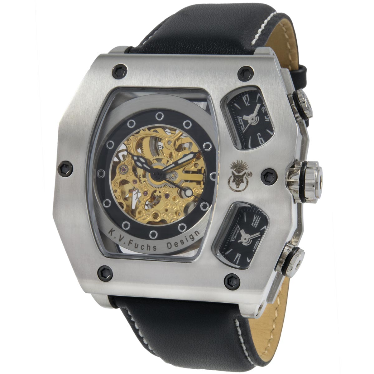 K.V. Fuchs Design Herren 1x Automatikuhr 2x Quarzuhr Edelstahl Armbanduhr Skelettuhr in gold, schwarz, silber mit Lederarmband in schwarz »KVFD-Schwarz«