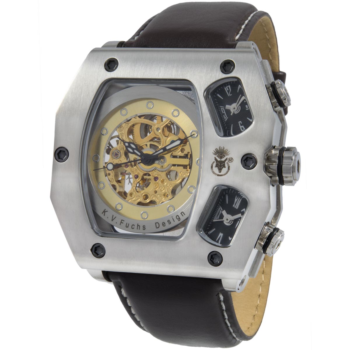 K.V. Fuchs Design, Armbanduhr, Herren, analog, Echtleder, silber, gold, schwarz, braun, Drei Zeiten (1x Automatik-, 2x Quarzwerk), Glasboden, Skelettuhr, Römische Ziffern, 3 ATM - 14041520