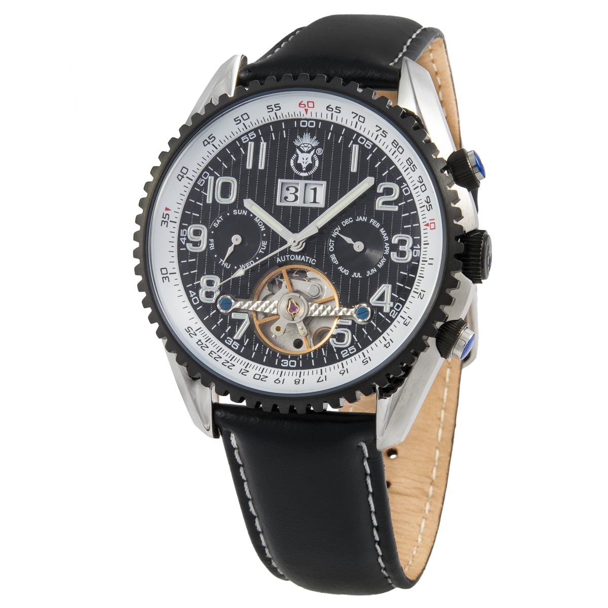 Diese edle Automatik-Uhr verfügt über ein flaches, IP-beschichtetes Edelstahl-Gehäuse. Das schwarze Leder-Armband mit weißer Steppnaht und Dornschließe bietet einen hohen Tragekomfort. Das analoge Ziffernblatt zeigt neben der Datumsanzeige auch Monat und Wochentag an. Durch den Glasboden können Sie die Uhr arbeiten sehen. Die komplett in Schwarz gehaltene Uhr zieht Blicke auf sich.