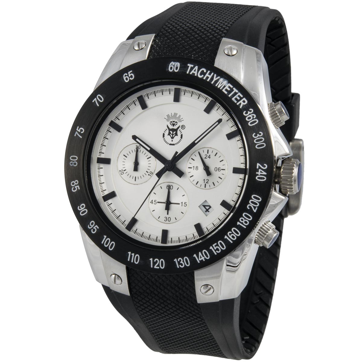 Ein gelungenes Zusammenspiel des matt polieren Edelstahl-Gehäuses mit einem angenehmen Silikon-Armband verleiht diesem Chronographen eine sportliche Note. Das strukturierte Ziffernblatt lässt die gestoppten Minuten und Sekunden gut erkennen. Auch das Datum ist auf einen Blick zu erkennen. Das weiße Ziffernblatt bietet einen harmonischen Übergang zum hellen Gehäuse.