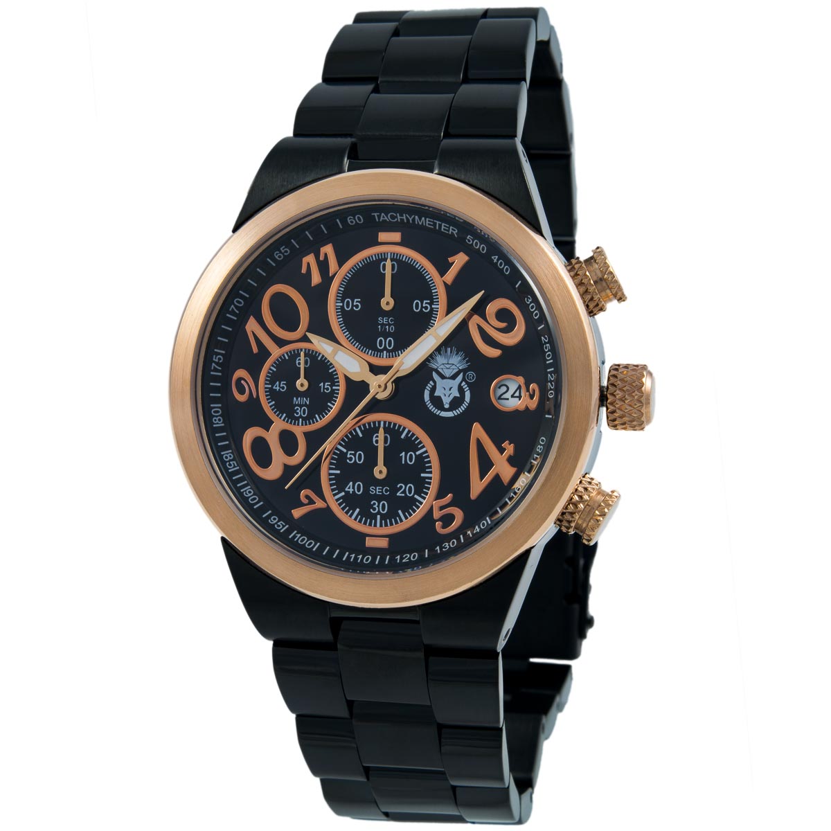 K.V. Fuchs Design Herren Chronograph Armbanduhr mit Datum, Stoppfunktion in rotgold, schwarz mit Edelstahlarmband in schwarz »CH-149-05-Schwarz«
