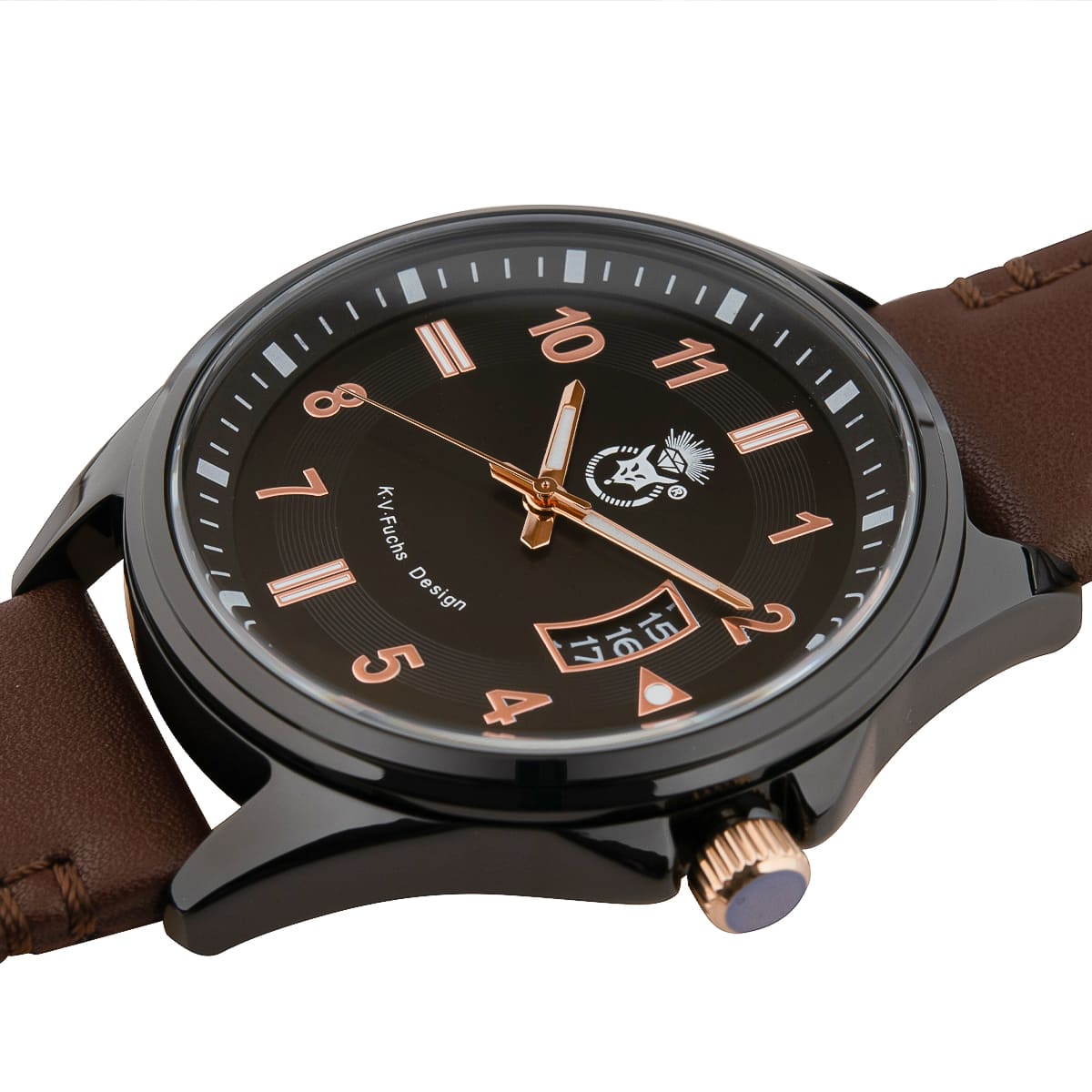 K.V. Fuchs Design Herren Quarzuhr analog Armbanduhr in schwarz mit Lederarmband in braun »U-69-06-Braun-Schwarz«