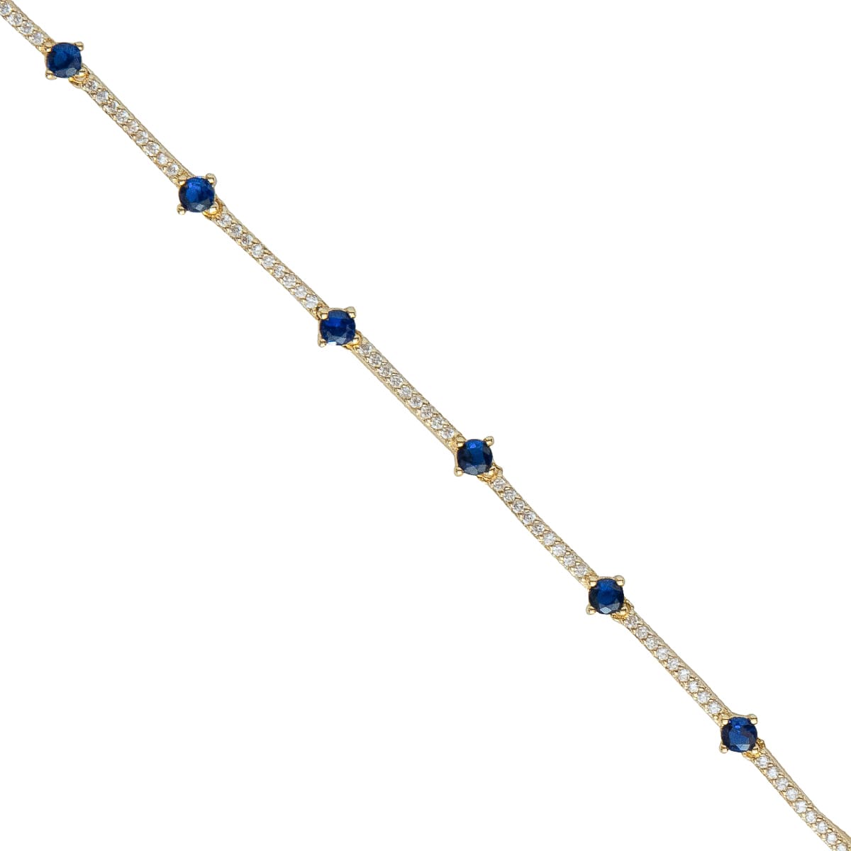 Klassisch - elegant. Goldfarbene Glieder mit funkelnden Schmucksteinen verziert, wechseln sich mit saphirblauen Schmucksteinen gekonnt ab. Durch das kleine Verlängerungskettchen kann das Armband individuell angepasst werden. Immer ein Highlight, ob zur Jeans oder zum Business-Outfit.