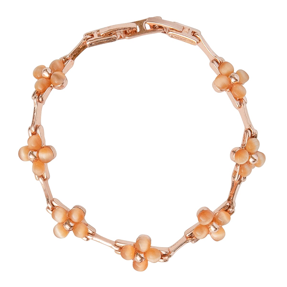 Wunderschön. Schicke mondsteinfarbene Schmucksteine zu einer entzückenenden Blüte mit rotgoldenem Mittelpunkt vereint, reihen sich harmonisch mit rotgoldenen Gliedern aneinander. Durch den praktischen Clipverschluss kann das Armband um 1 Glied gekürzt werden. Tolles Armband für den den Romantik-Look.
