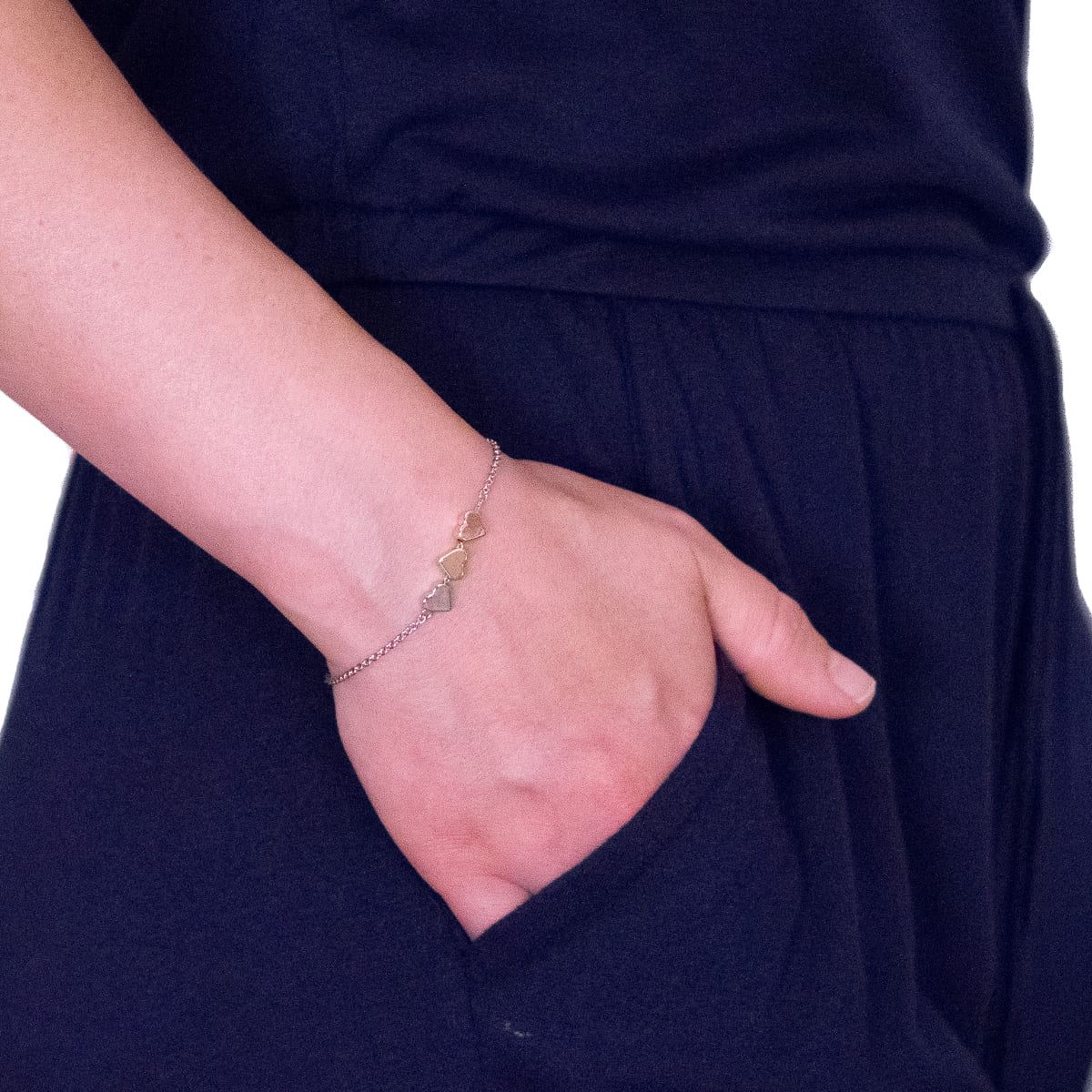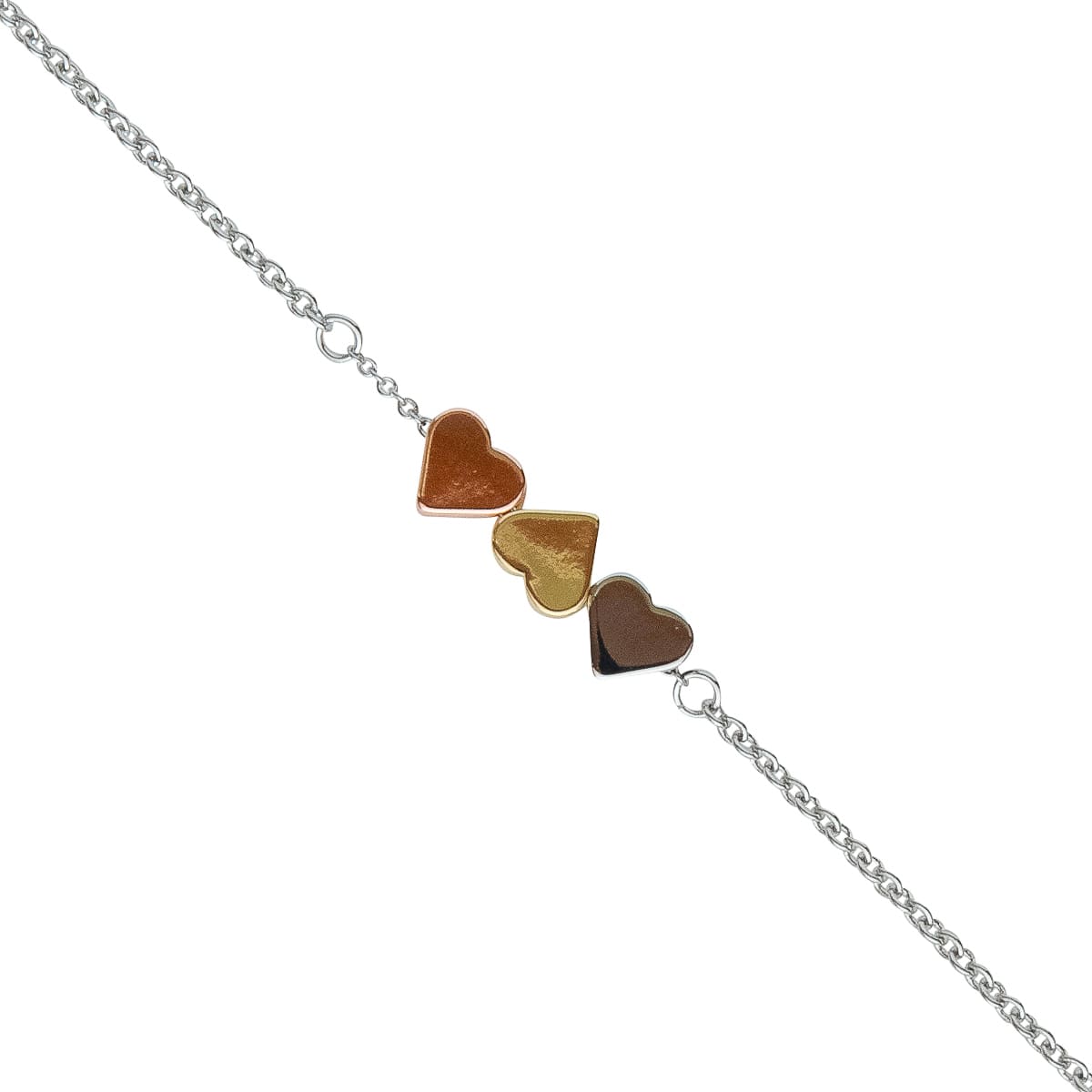 Love is in the Air... Drei kleine Herzen zieren das filigrane Armband. Die zarte silberfarbene Ankerkette passt perfekt zu den kleinen Herzen in den Farben gold, rotgold und silber. Durch das kleine Verlängerungskettchen kann das Armband individuell angepasst werden. Ein kleines Highlight für jeden Tag. Schöne Geschenkidee für einen Herzensmenschen.