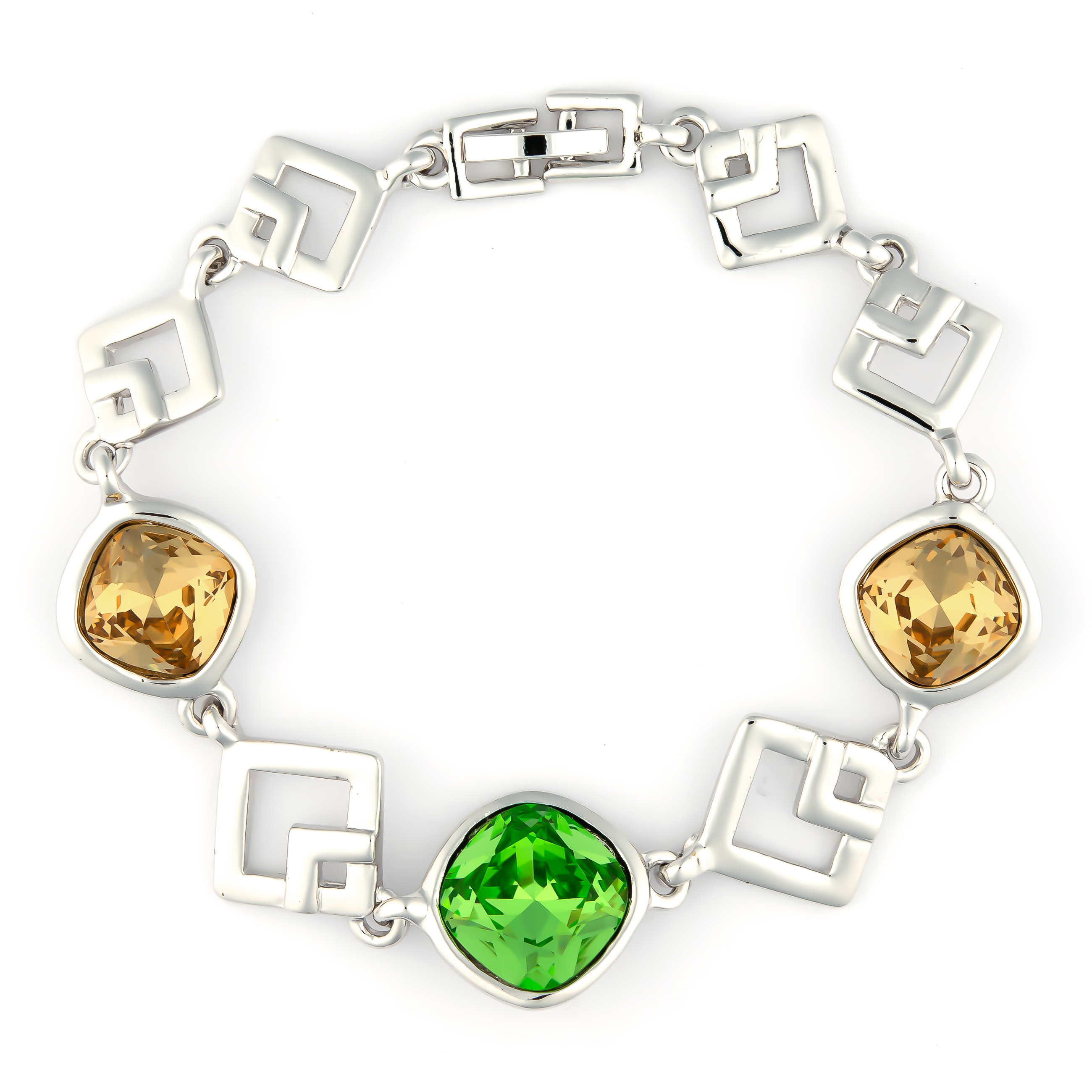 Eine schöne Farbkombination von leuchtendem grün und warmen topas ist bei diesem Armband gelungen. Die Schmucksteine im Facettenschliff harmonieren sehr schön zu dem Glieder-Armband in verspielter Viereckform. Durch den Clipverschluss lässt sich das Armband bequem An- und Ablegen. Das ansprechende Design ist vielfältig zu kombinieren.