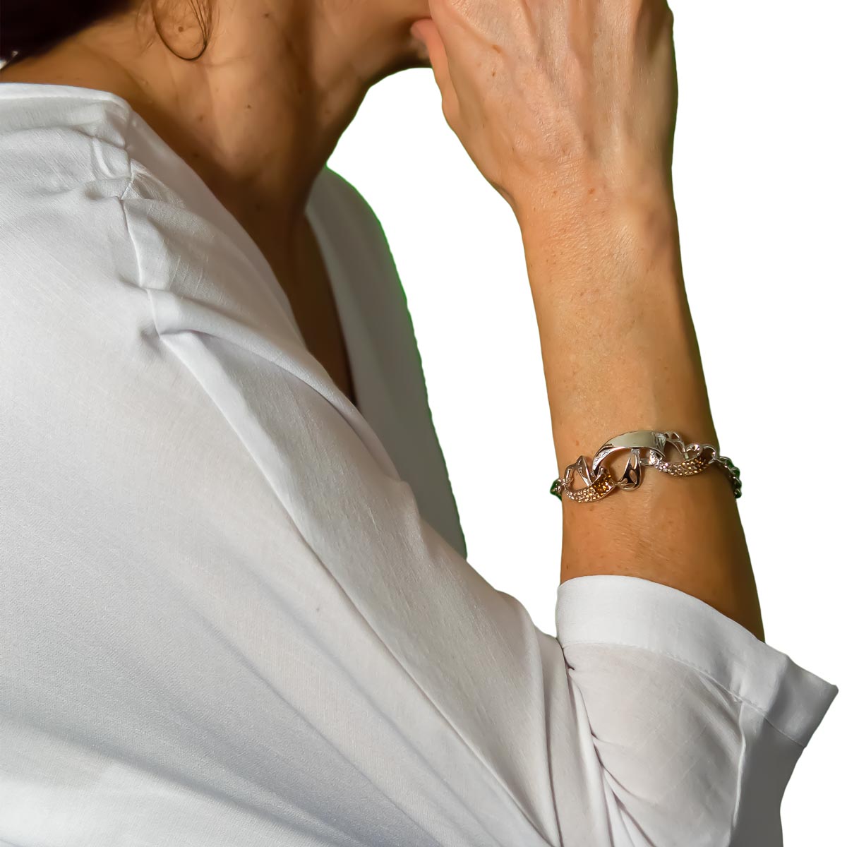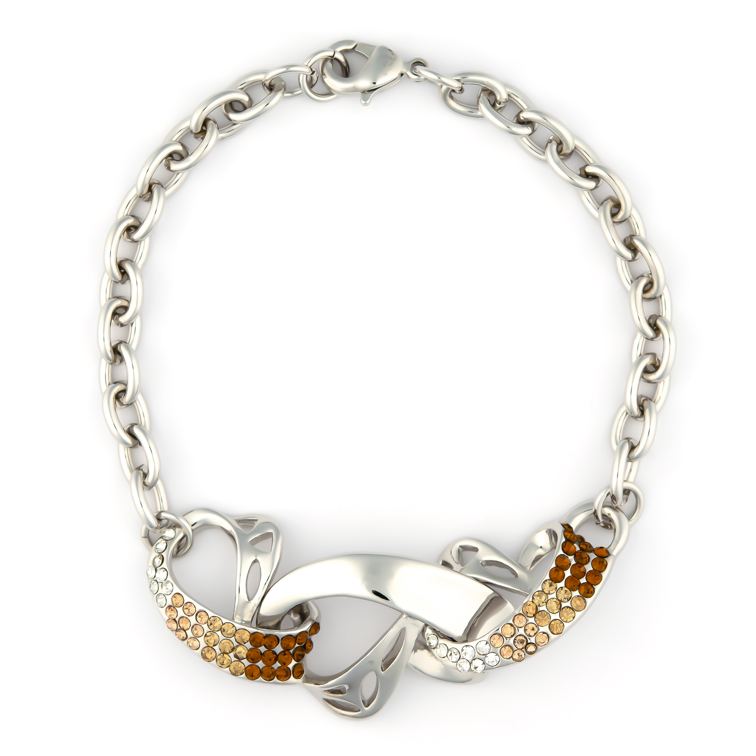 Das formschöne Armband schmiegt sich durch die leicht gebogene Form elegant ans Handgelenk. Funkelnde Schmucksteine in einem eleganten Farbverlauf von braun, topas und weiß unterstreichen die schicke Form. Eine Ankerkette mit Karabiner vervollständigt das Schmuckstück. Ein schickes Must-have, das Sie jeden Tag tragen können.