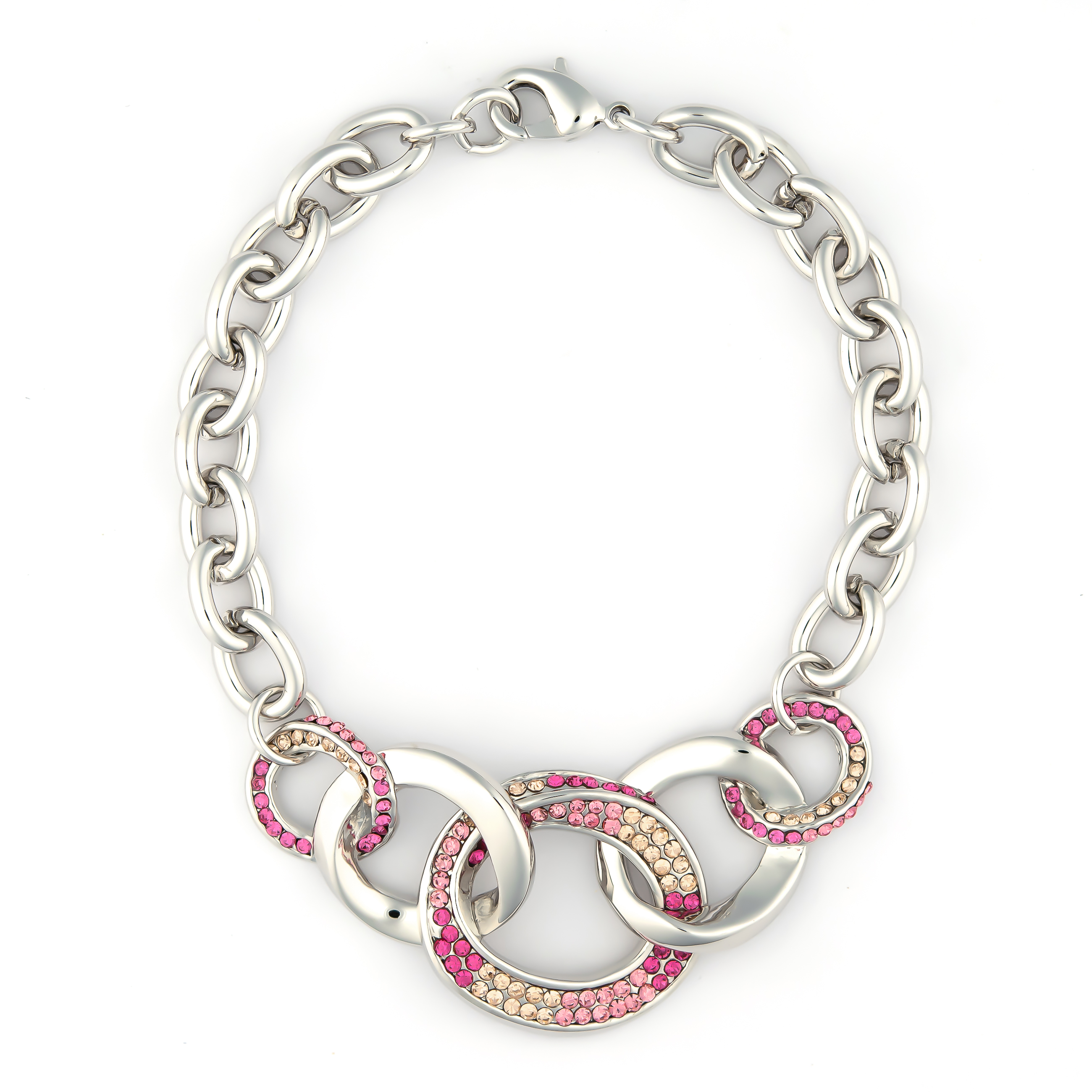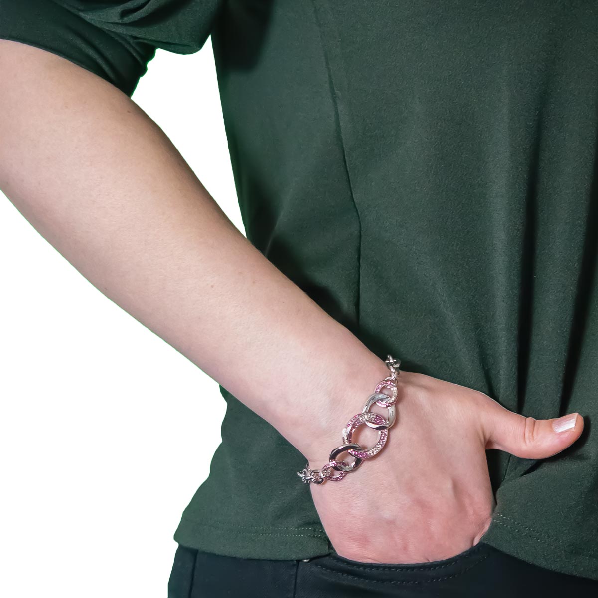 Ineinandergeschlungene Ringe machen dieses Armband zu etwas ganz Besonderem. Funkelnde Schmucksteine in einer eleganten Farbkombination von pink und hellem topas unterstreichen die schicke Form. Eine Ankerkette mit Karabiner vervollständigt das Schmuckstück. Passt zum täglichen Outfit und zum schicken Auftritt.