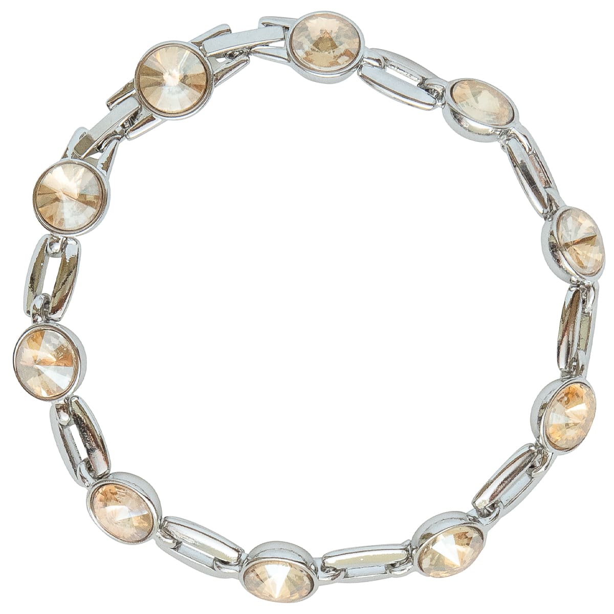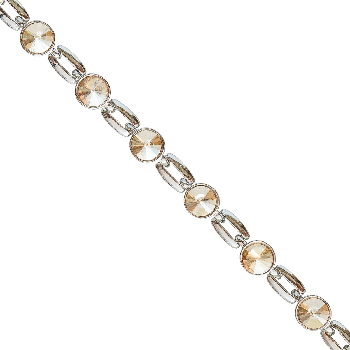 Zeitlos elegant zeigt sich das silberfarbene Gliederarmband. Funkelnde topasfarbene Schmucksteine im edlen Facettenschliff wechseln sich mit den silberfarbenen Elementen ab. Durch den Clipverschluss lässt sich das Armband bequem um ein Glied kürzen. Egal ob leger zur Jeans oder edel zur Business-Mode, immer etwas Besonderes!