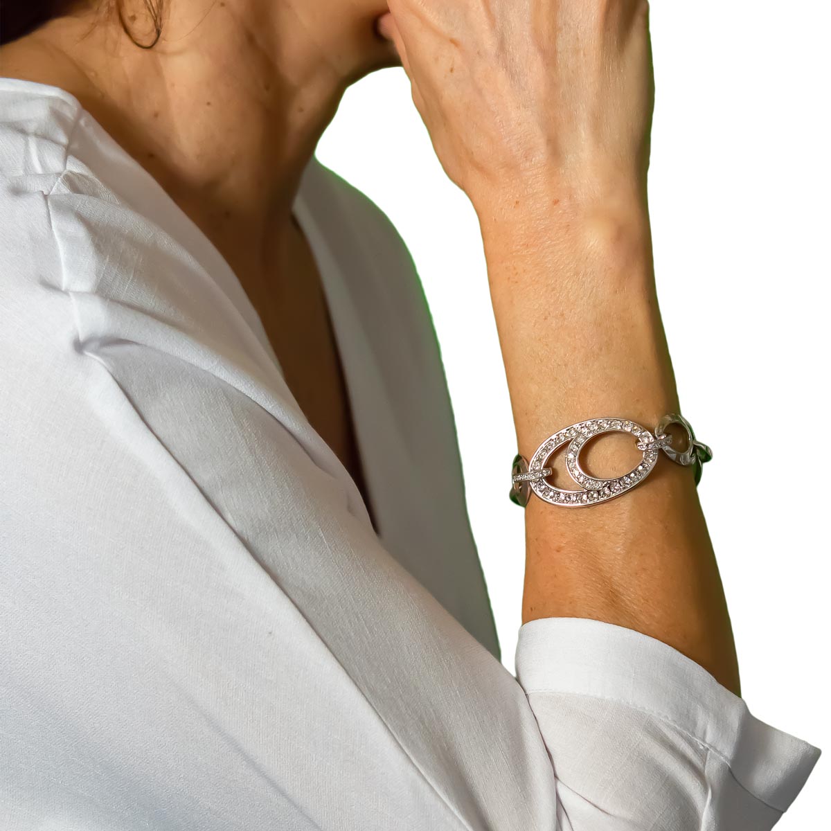 Ein auffälliges silberfarbenes Armband mit verschlungenen Ovalen. Die funkelnden Schmucksteine verleihen dem Armband Glamour. Durch die Verlängerungskette kann das Armband individuell angepasst werden. Ein toller Allrounder.