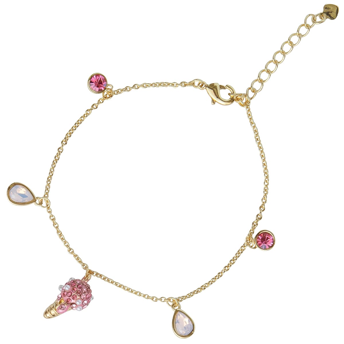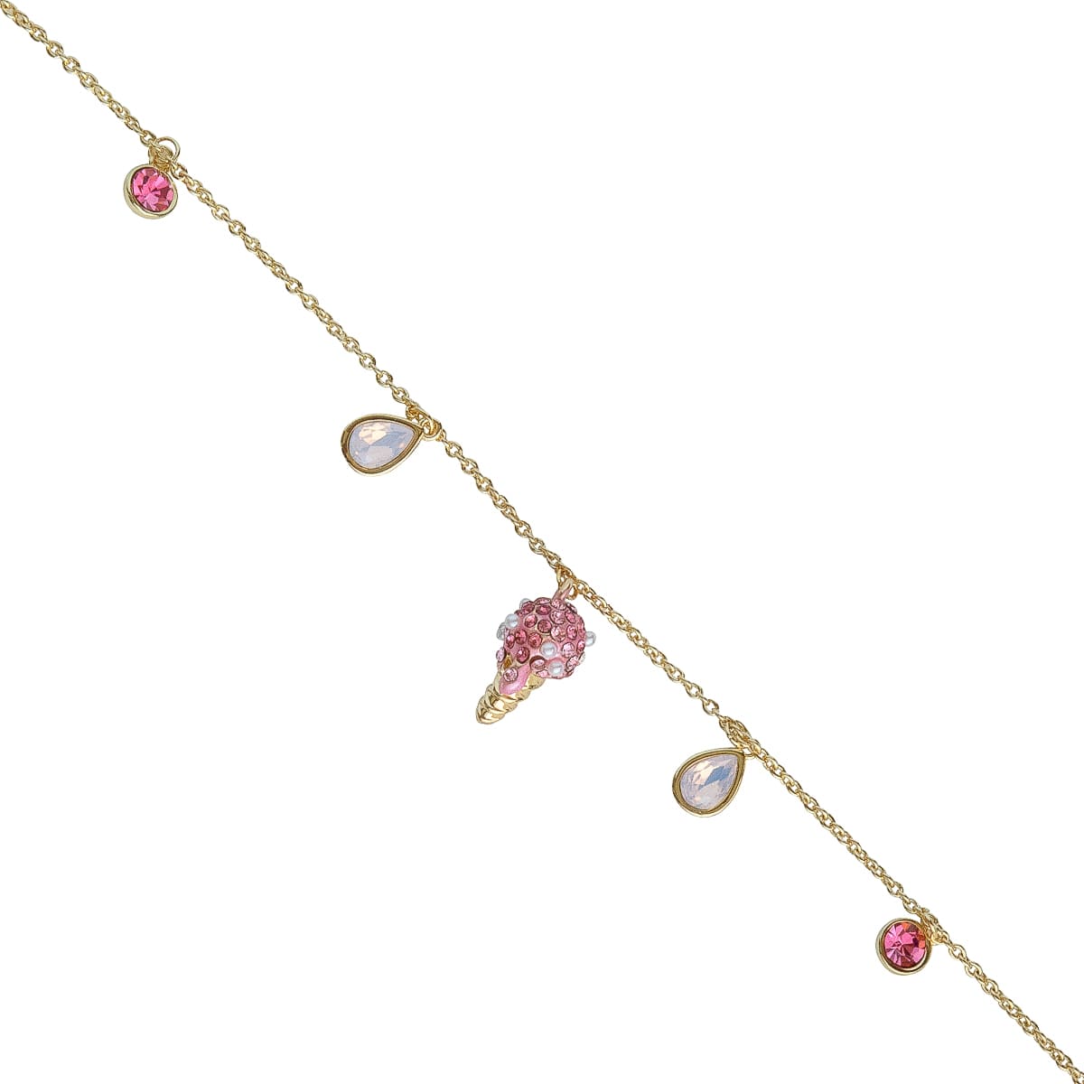 Klares Statement für alle Naschkatzen. Das feine goldfarbene Armband mit liebevoll gestalteter Eistüte, garniert mit funkelnden Schmucksteinen. Kleine Schmucksteine in pink,rosa und weiß begleiten das Ankerkettchen gekonnt. Sommer, Sonne und Eis gehören einfach zusammen. Holen Sie sich die Sommerlaune ans Handgelenk.