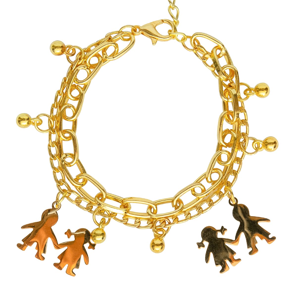 Süßes Accessoire. Die doppelte goldfarbene Ankerkette als schickes Bettelarmband. Zwei liebevoll gestaltete Anhänger als Best Friends werden von kleinen goldenen Kugeln unterstützt. Durch das Verlängerungskettchen individuell verstellbar. Ein schöner Blickfang. Machen Sie sich oder anderen eine Freude!