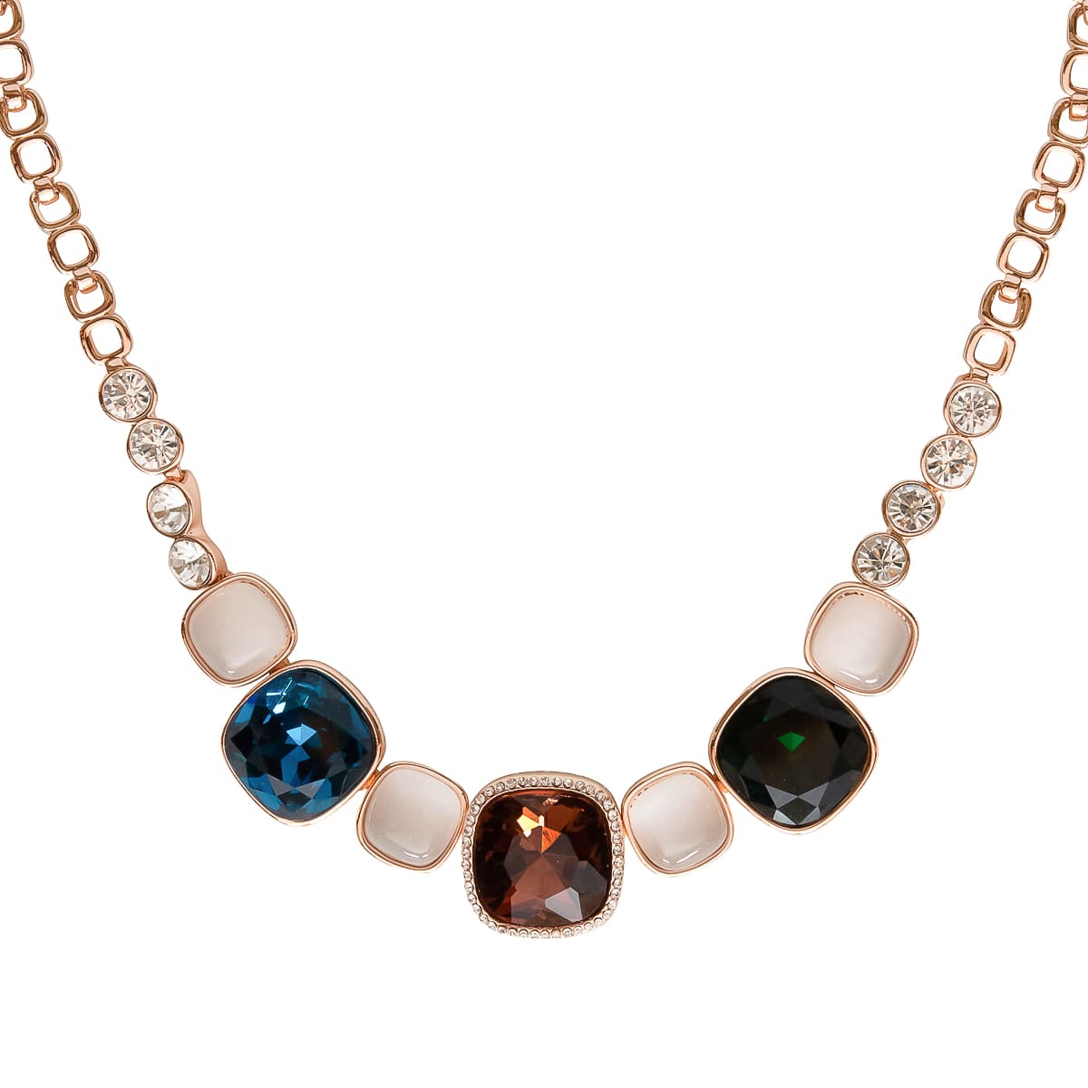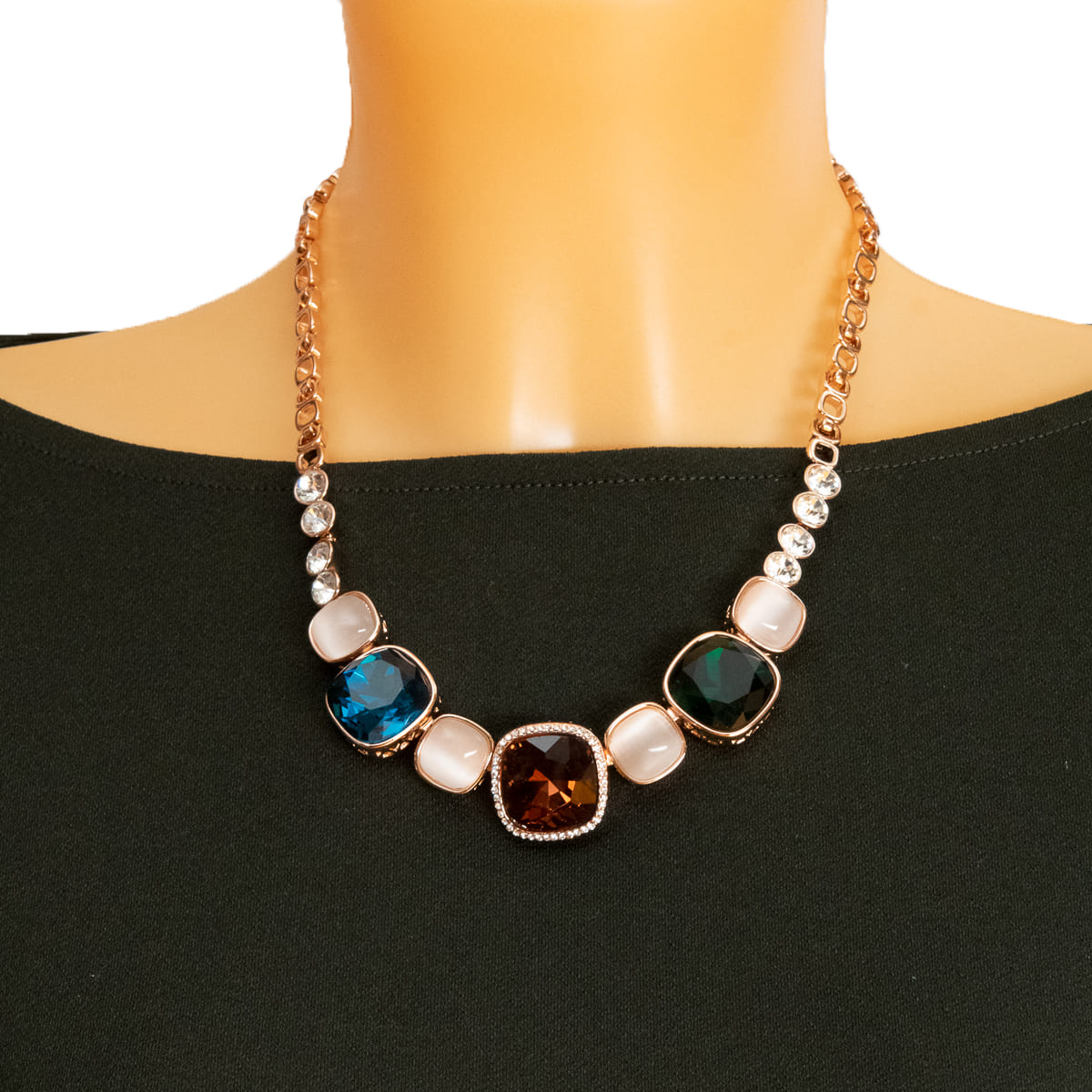 Ein trendiges rotgoldenes Statement-Collier mit WOW Effekt. Die gelungene Farbkombination von sattem violett, saphirblau, smaragdgrün und edlem mondstein harmoniert perfekt miteinander. Der Facettenschliff lässt die Schmucksteine glänzen und setzt sie gekonnt in Szene. Passt zum schicken Abendkleid und verwandelt die weiße Bluse mit Jeans zu einem echten Hingucker. Ein wahres Lieblingsstück.