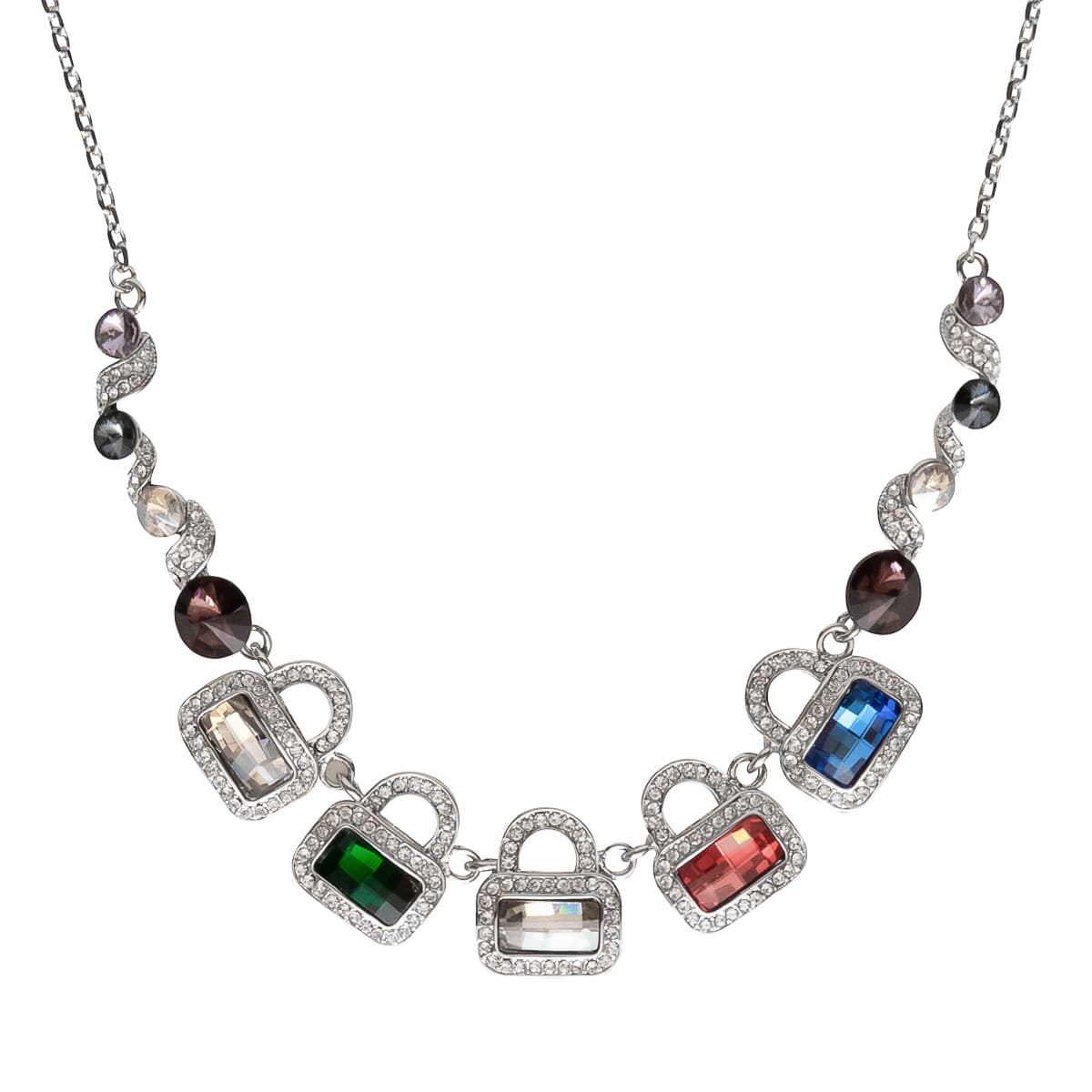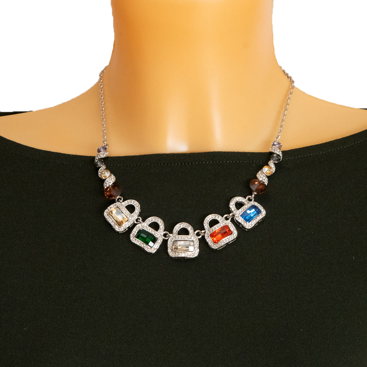 Ein toller Stylingbegleiter für viele verschiedene Looks. Im Zentrum des Designs stehen 5 kleine Handtaschen. Die toll aufeinander abgestimmten Schmucksteine schimmern dank des edlen Facettenschliffs im Licht. Die kleinen Handtaschen werden von funkelnden Schmucksteinen umrandet und perfekt in Szene gesetzt. Abgerundet von je vier runden Steinen an einer schlichten Ankerkette.