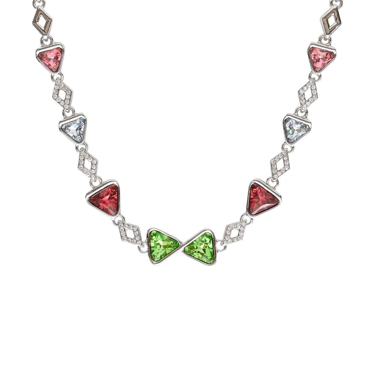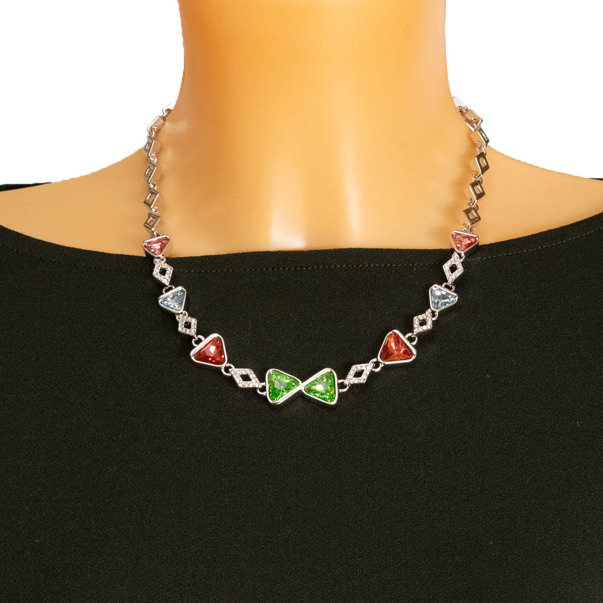 Ein tolles Accessoire für jeden Tag. Farbenfrohe Dreiecke, farblich gekonnt kombiniert zeigen sich von Ihrer schönsten Seite. Schmucksteine in leuchtendem Grün, Pink, Rosé und Hellblau bilden ein bezauberndes Farbarrangement. Durch den Facettenschliff glänzen die edlen Farben im Licht. Unterstützt wird das Design von rautenförmigen Zwischengliedern mit funkelnden Schmucksteinen.
