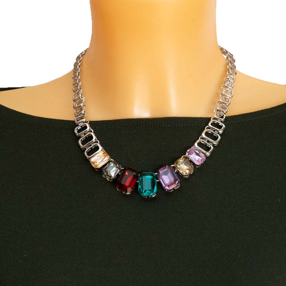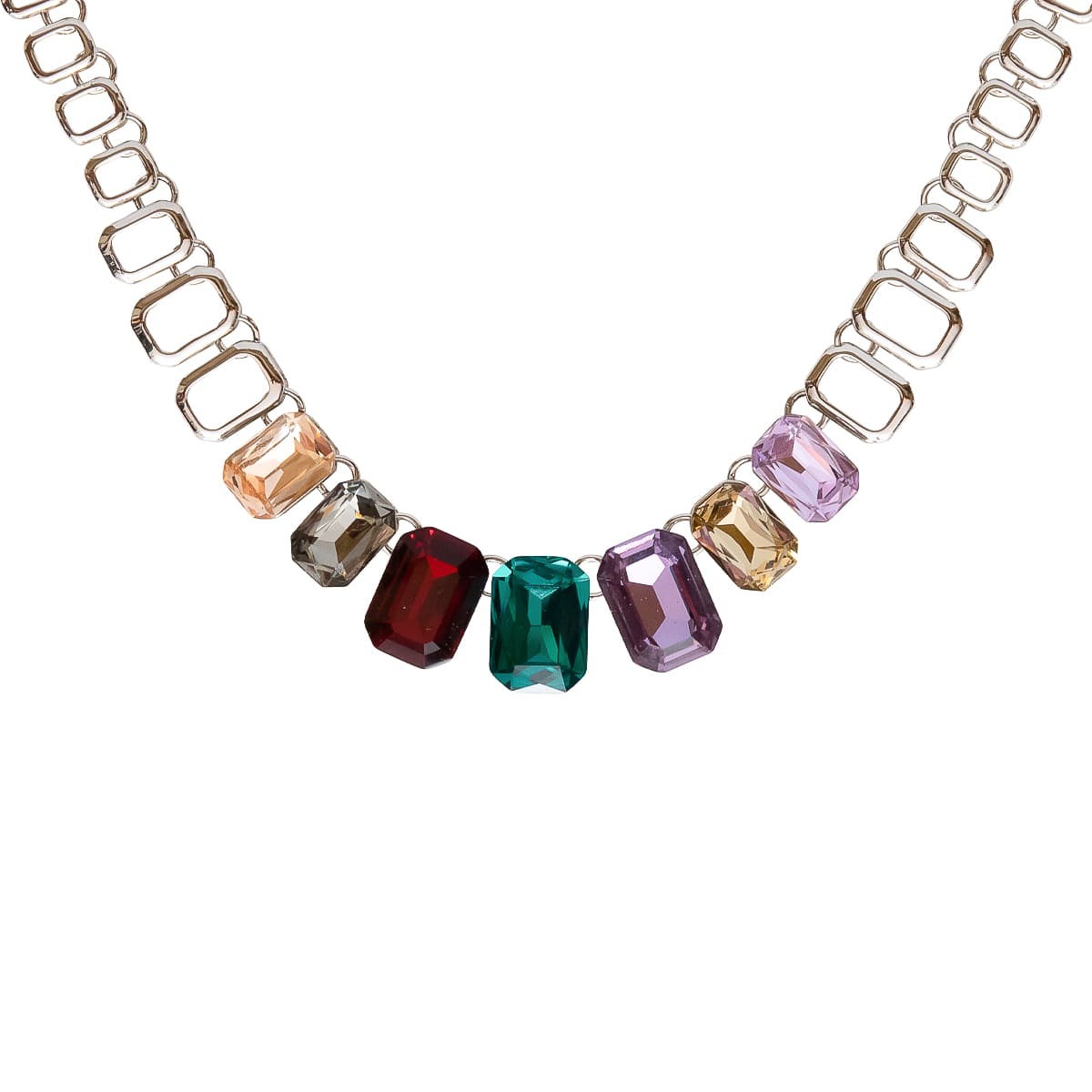 Die grobe Gliederkette mit geschliffenen Baguettesteinen lässt Sie in jedem Outfit elegant erstrahlen. Sieben funkelnde Schmucksteine im edlen Facettenschliff wurden gekonnt aufeinander abgestimmt und schimmern im Licht. Durch die Farbvielfalt des XL-Colliers rundet Sie jedes Styling perfekt ab. Vielfältig zu kombinieren.