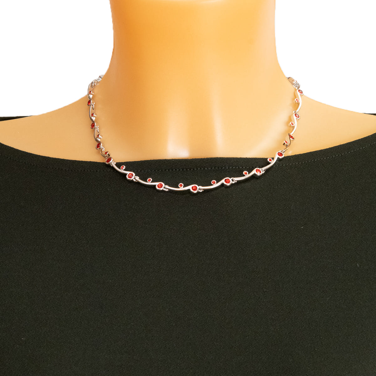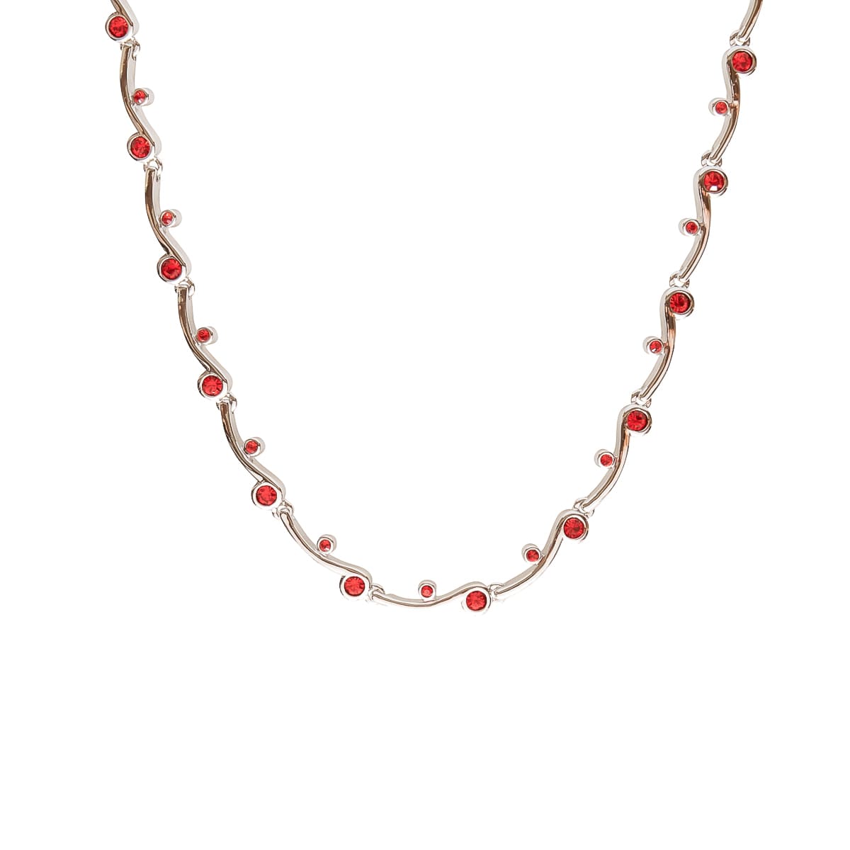 Ein modernes Collier mit femininem Design, ein Hingucker für viele Gelegenheiten. Formschöne silberfarbene Glieder mit einer glänzenden Oberfläche lassen die Schmucksteine in rot noch mehr funkeln. Das Collier erscheint in elegant schicker Optik und wertet Ihr Outfit gekonnt auf.