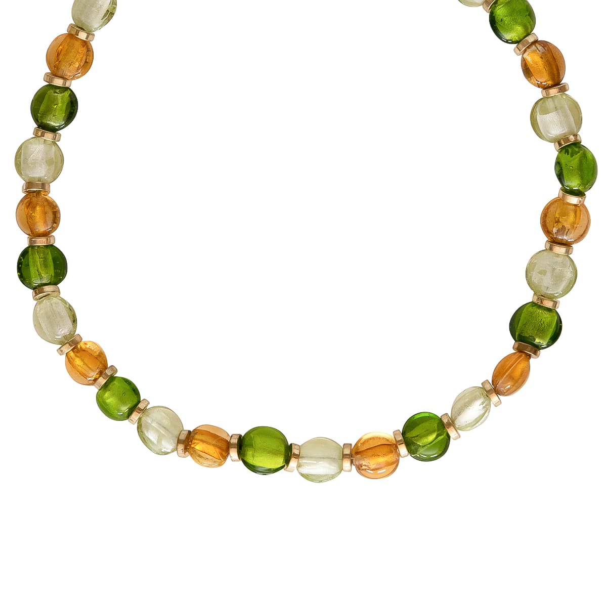 Klassisch, schlicht und zeitlos überzeugend ist das Collier aus Muranoglas. Farblich aufeinander abgestimmt reihen sich Topasfarbene, Weiße und Grüne Glasperlen aneinander. Die klassische Kette rundet Ihren Look perfekt ab.