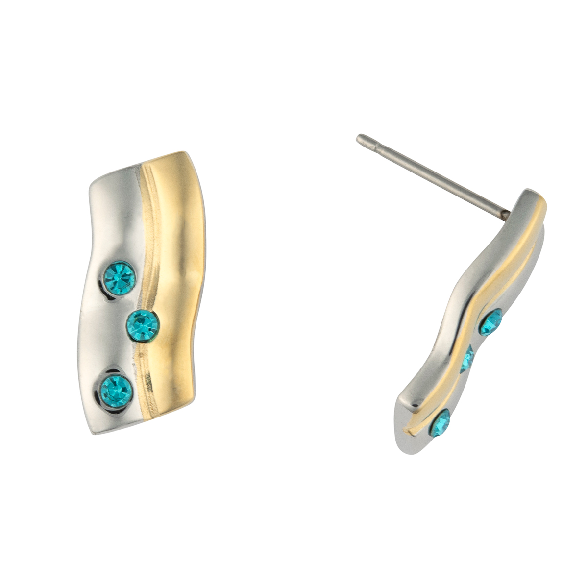 Die zeitlosen Edelstahl-Ohrstecker überzeugen durch die geschwungene Optik. Das Design in bicolor wird von funkelnden Schmucksteinen in Hellblau gekonnt unterstützt. Ein echter Klassiker.