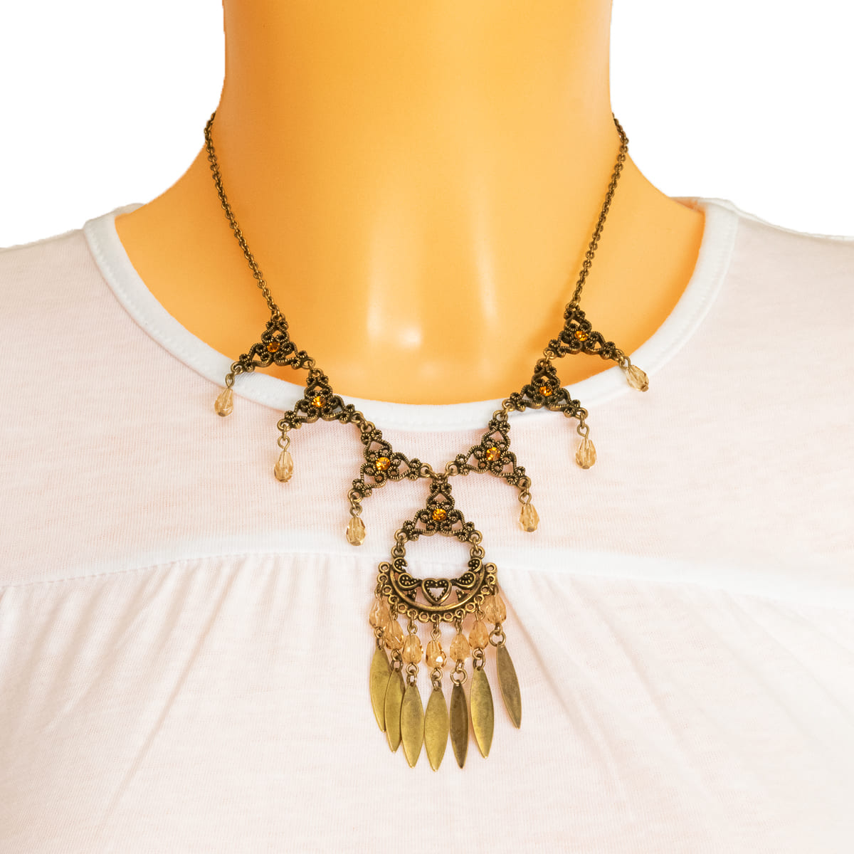 Im angesagten Vintage-Look zeigt sich die Statement-Kette in mattem Gold. Begleitet von orange- und topasfarbenen Schmucksteinen strahlt die Kette im Hippie-Look. Sehr schön zu sommerlichen Outfits.