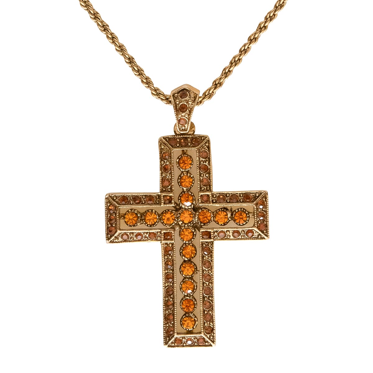 Der goldene Kreuzanhänger im Vintage-Look als persönliches Statement. Verschiedene orangefarbene Schmucksteine gestalten den Anhänger im angesagten Antikstyle. Die goldfarbene Kordelkette kann dank der Verlängerung individuell verlängert werden. Der zeitlose Anhänger erscheint lässig zum Casual-Look.