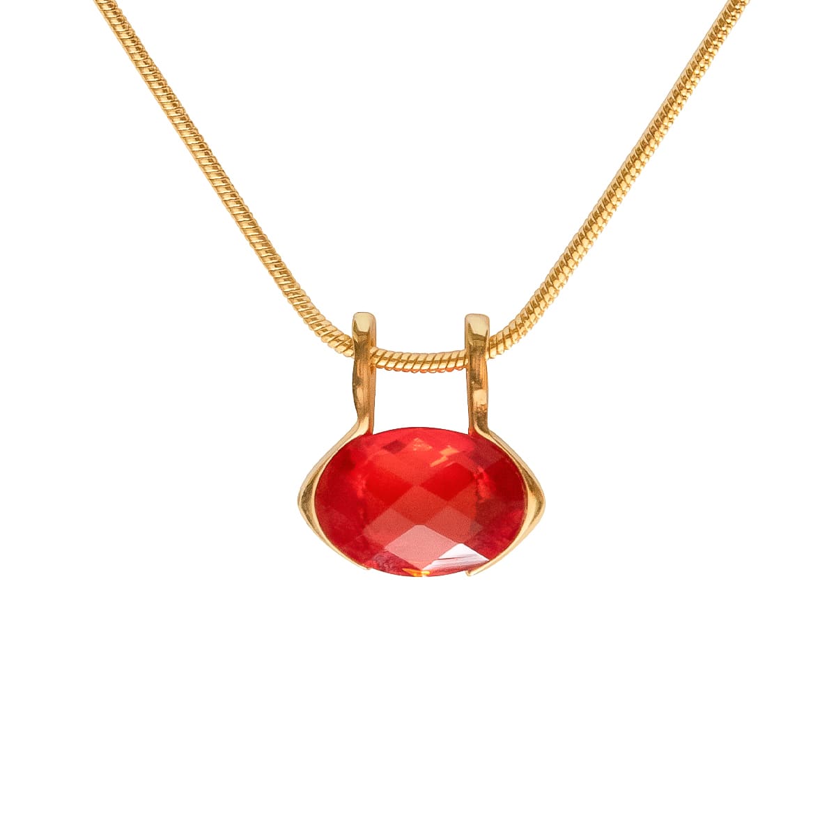 Hier steht der funkelnde Schmuckstein in strahlendem Rot im Mittelpunkt. Der edle Facettenschliff verleiht dem Stein seinen besonderen Glanz. Begleitet von einer schlichten goldfarbenen Schlangenkette ein tolles Schmuckstück, das Sie jeden Tag neu kombinieren können.