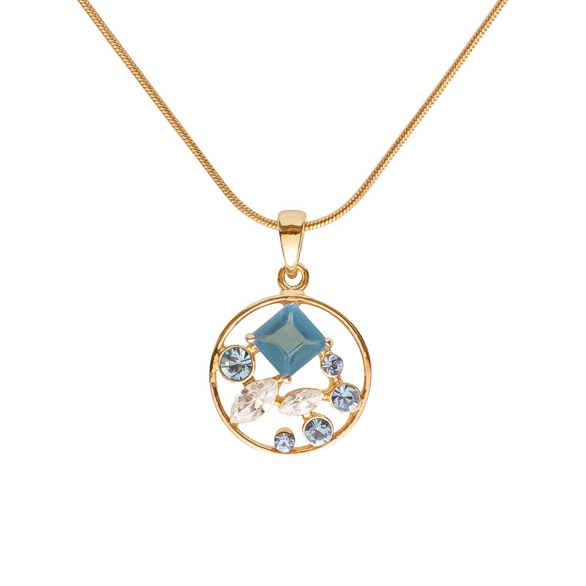 Ein filigraner Blickfang für Ihr Dekolleté. Elegant wurden hier die funkelnden Schmucksteine in Blau und Weiß mit dem goldfarbenen Anhänger kombiniert. Die Schlangenkette passt hervorragend ins Design.