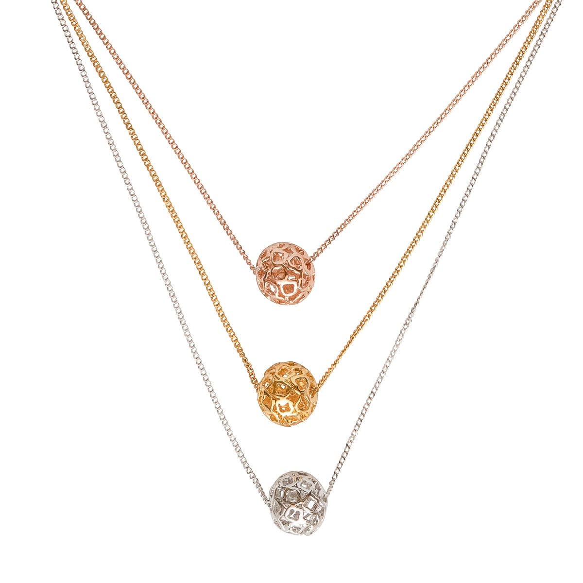 Ein echtes Lieblingsstück, die Kette in Gold, Rotgold und Silber lässt sich vielfältig kombinieren. Der bezaubernde Tricolor-Look wird von drei filigranen Ankerketten dargestellt. Designschöne Kugeln im Metall-Look vervollständigen das elegante Design. Sehr schön zum klassischen Look.