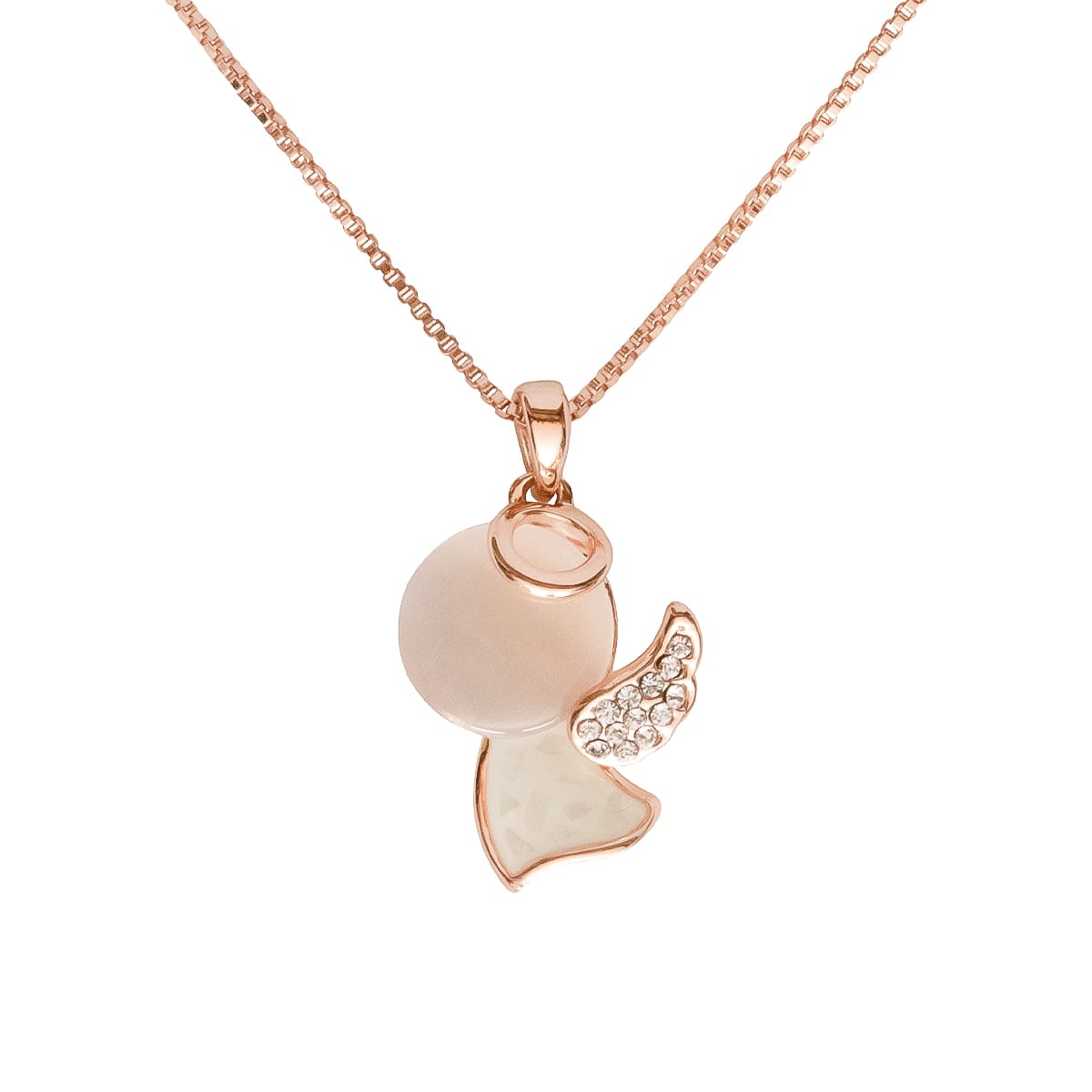 Ein Geschenk für einen Lieblingsmenschen? Ein Schutzengel. Mit Liebe zum Detail wurde der rotgoldene Anhänger gestaltet. Schimmernder Mondstein formt den Engel mit einem kleinen Heiligenschein, begleitet von einem Flügel mit funkelnden Schmucksteinen besetzt. Eine filigrane Venezianer-Kette macht das Schmuckstück komplett.