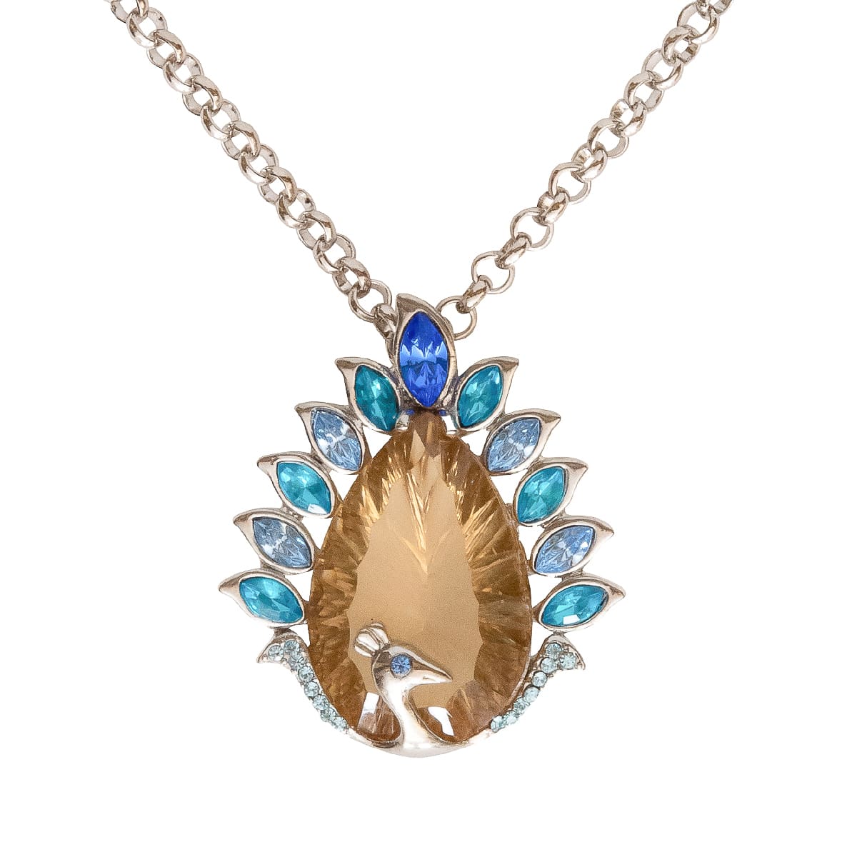 Der Pfau steht symbolisch unter anderem für Unsterblichkeit und Schönheit. Hier als glänzender Schmuckstein in hellem gelb. Umrandet von kleinen Schmucksteinen in abgestimmten blauen Farbverlauf. Der Facettenschliff der Steine lässt diese gekonnt erstrahlen. Eine Ankerkette macht das Schmuckstück komplett. Ein schöner Hingucker mit Botschaft.