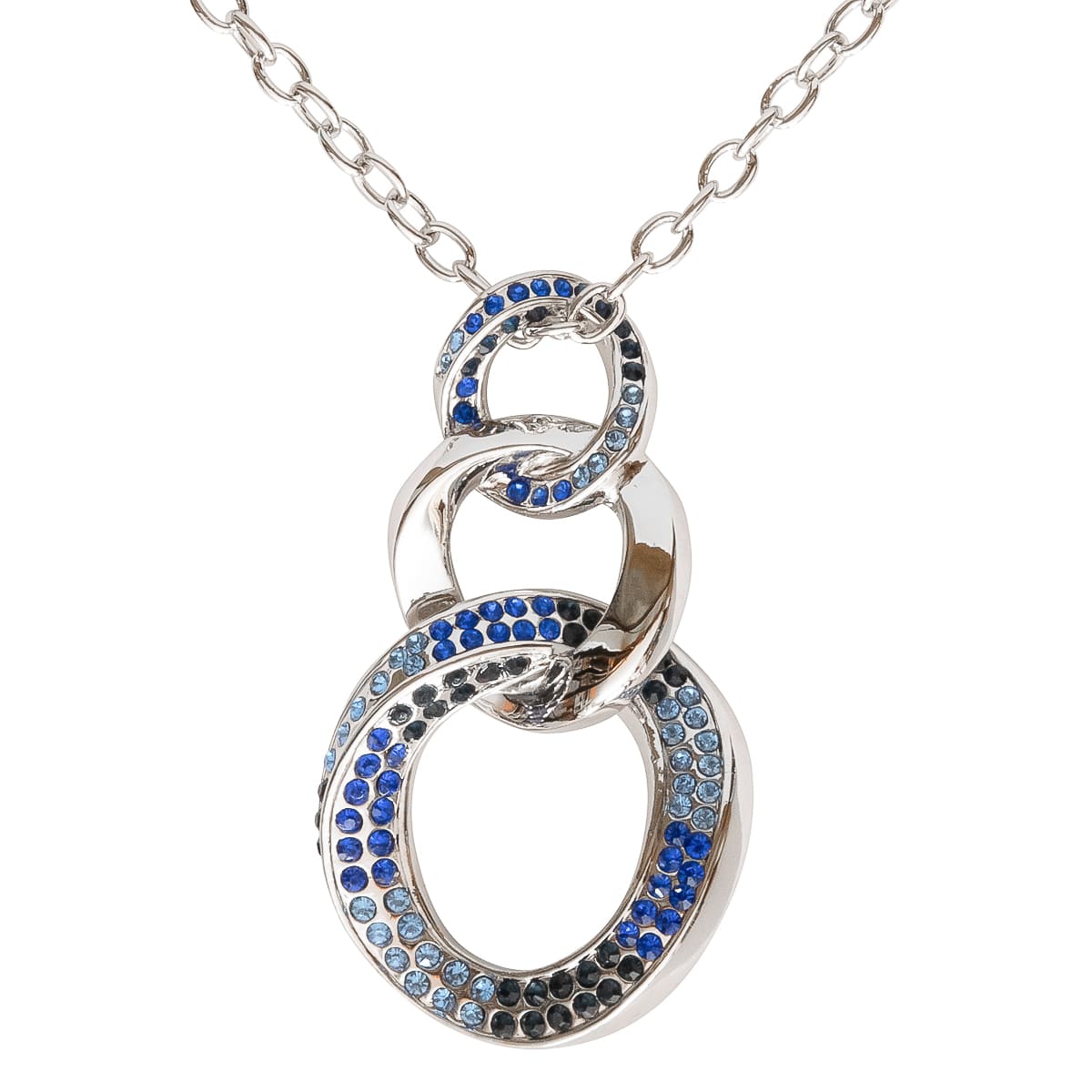 Drei ineinander verschlungene Kreise als Anhänger werden mit einer Ankerkette zum eleganten Schmuckstück. Die Kreise sind mit funkelnden Schmucksteinen in verschiedenen Blautönen besetzt. Sehr schön zur weißen Bluse mit Jeans. Toll zu kombinieren.