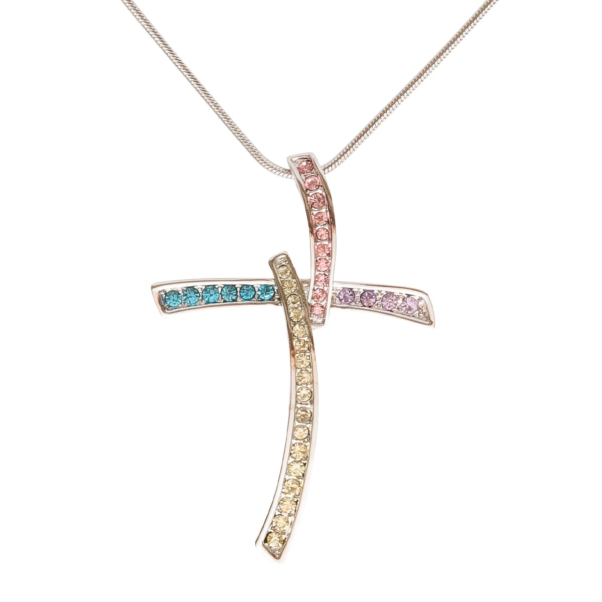 Der Kreuz-Anhänger wird als religiöses Symbol und auch als Fashion-Statement getragen. Hier als moderne Interpretation mit funkelnden Schmucksteinen in Rosa, Blau, Gelb und Lila. Eine silberfarbene Schlangenkette macht das Schmuckstück komplett. Dank der tollen Farbkombination ein toller Begleiter für jeden Tag.