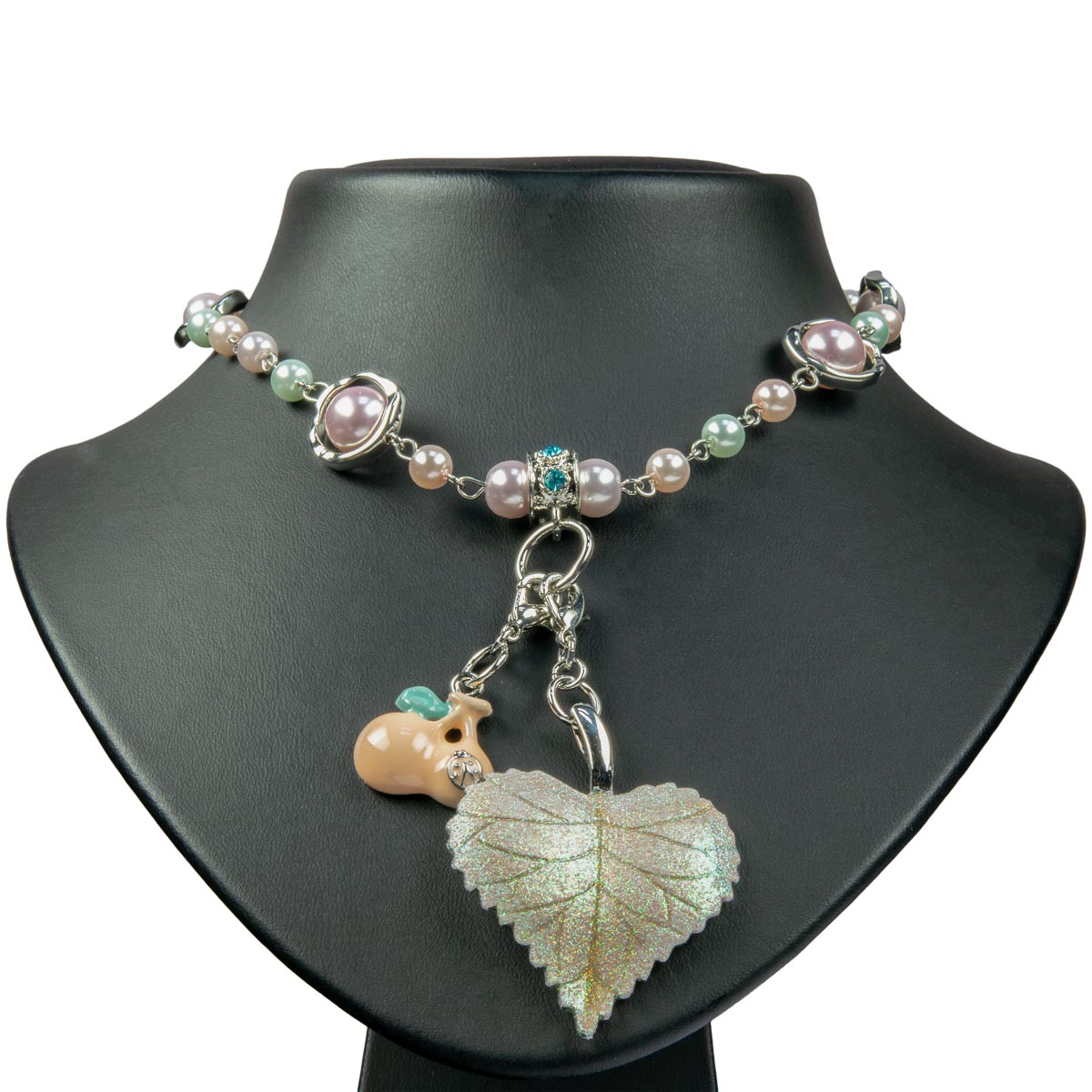 Feminin elegant zeigt sich die pastellfarbene Perlenkette. Mit viel Liebe zum Detail wurden Metallelemente mit unterschiedlichen Perlen kombiniert. Der Hingucker sind zwei Charms die sich auch einzeln tragen lassen. Ein elegant schimmerndes Blatt in Herzform und zwei Kirschen in Pastellrosa. Vervollständigt Ihren Look in Pastelltönen gekonnt.