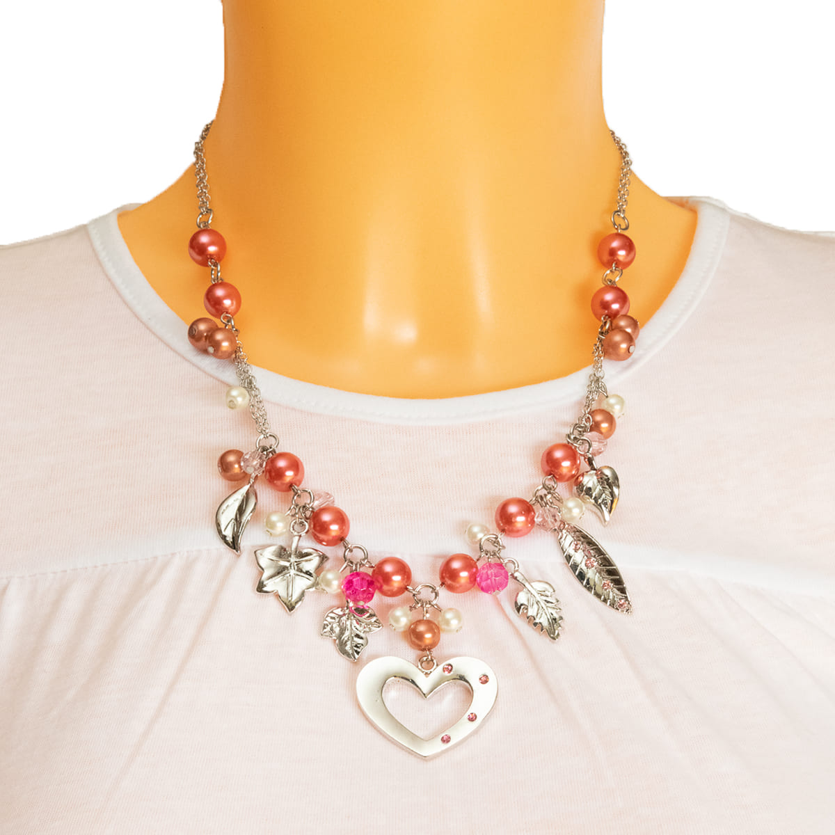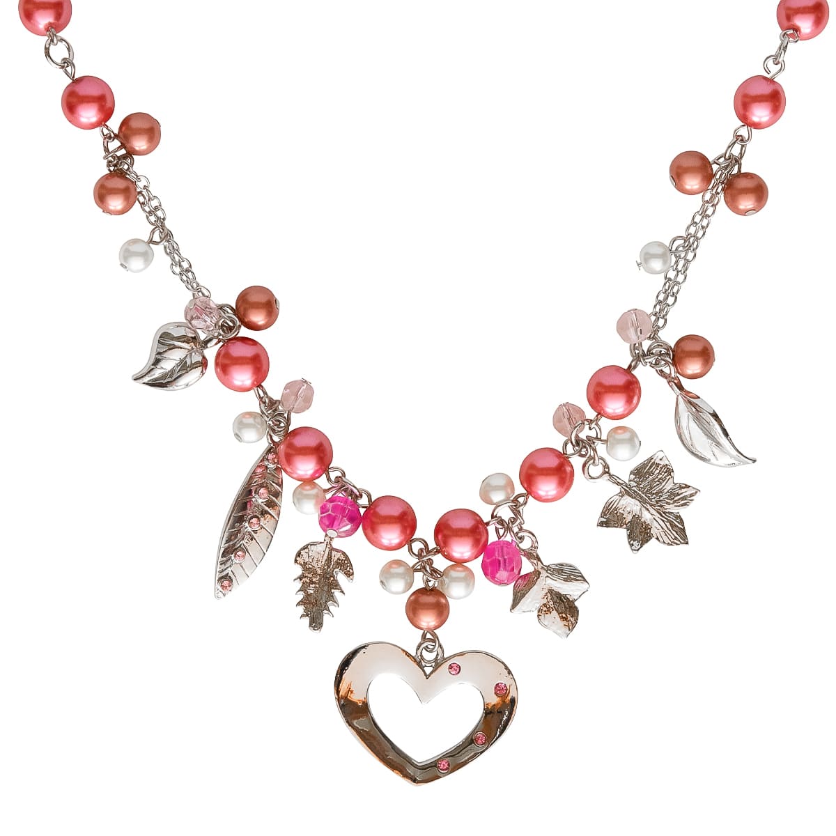 Das Herz als Zeichen der Liebe für alles Schöne. Bei diesem Schmuckstück wurde es liebevoll mit pinken, roséfrabenen und weißen Kugeln kombiniert. Glänzende silberfarbene Blätter zum Teil mit schicken Schmucksteinen ergänzen das Design gekonnt. Ein toller Begleiter für Ihr Sommeroutfit.