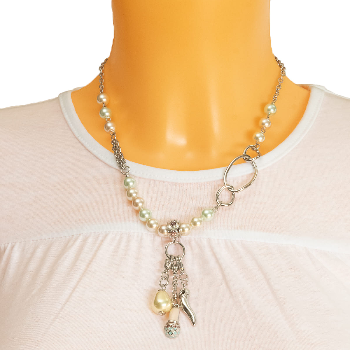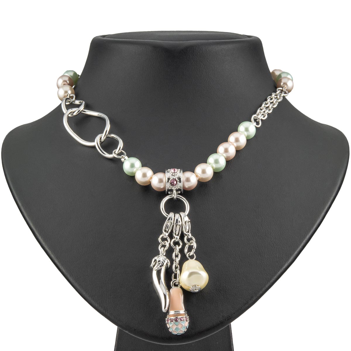 Eine aufwendig gestaltete Kette mit Perlen in Pastellfarben zeigt sich von der verspielten Seite. Der Hingucker sind die drei Charms die sich auch einzeln tragen lassen. Eine silberfarbene Peperoni, ein Schuh in Pastelltönen und eine Perle reihen sich gekonnt ins Design ein. Sehr schön zu allen Looks in Pastelltönen.